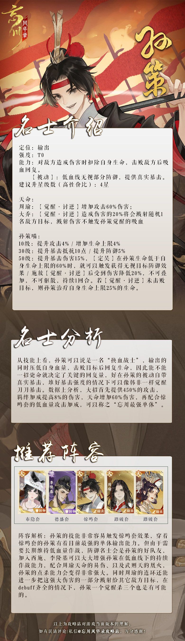 从孙策的技能上看,可以说是一名“换血战士”,输出的同时压低自身血量,击败目标后回复生命,因此能不能一招毙命就决定了关键的回复量,好在孙策的被动自带真实暴击,堆好暴击强度的情况下可以像韩非一样觉醒刀刀暴击。数据上分析,大招首先提供450%的攻击,羁绊加成提高8%的伤害,天命增加60%伤害,再配合惊鸣套的低血量攻击加成,可以称之“忘川最强单体”。 周瑜在队伍实战应用中,需要一速先手上连索,因此需要优先