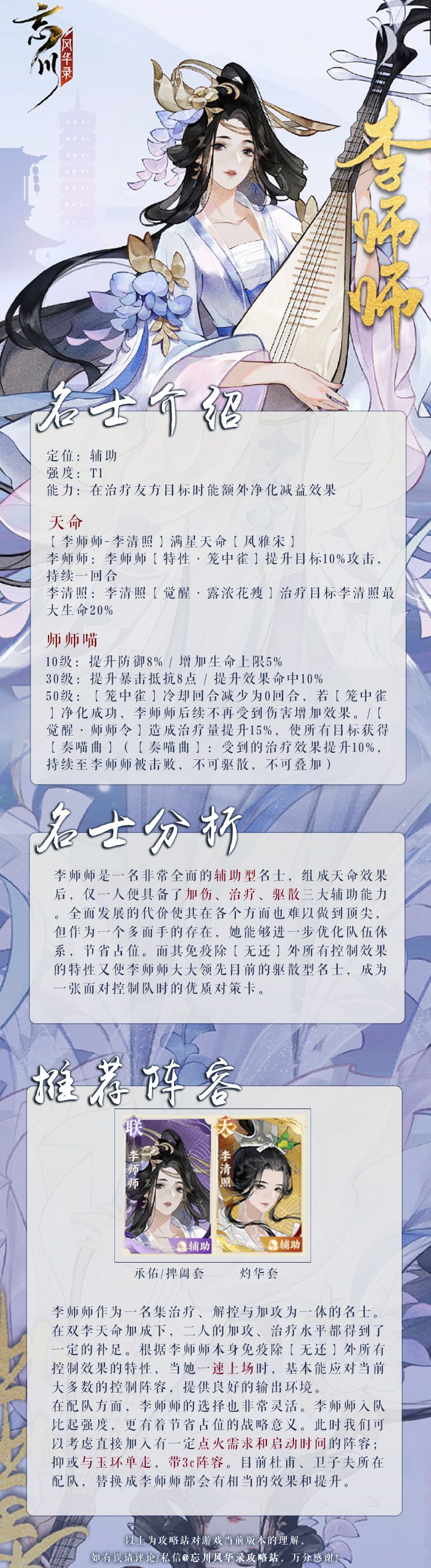 作为一个功能全面的辅助多面手,李师师加入忘川能为许多队伍节约占位。双李天命下的加攻、治疗、驱散都是非常强势的辅助手段。再搭配李师师本身免疫绝大多数控制的特性,使其成为了一名在面对控制阵容时的优质对策角色。