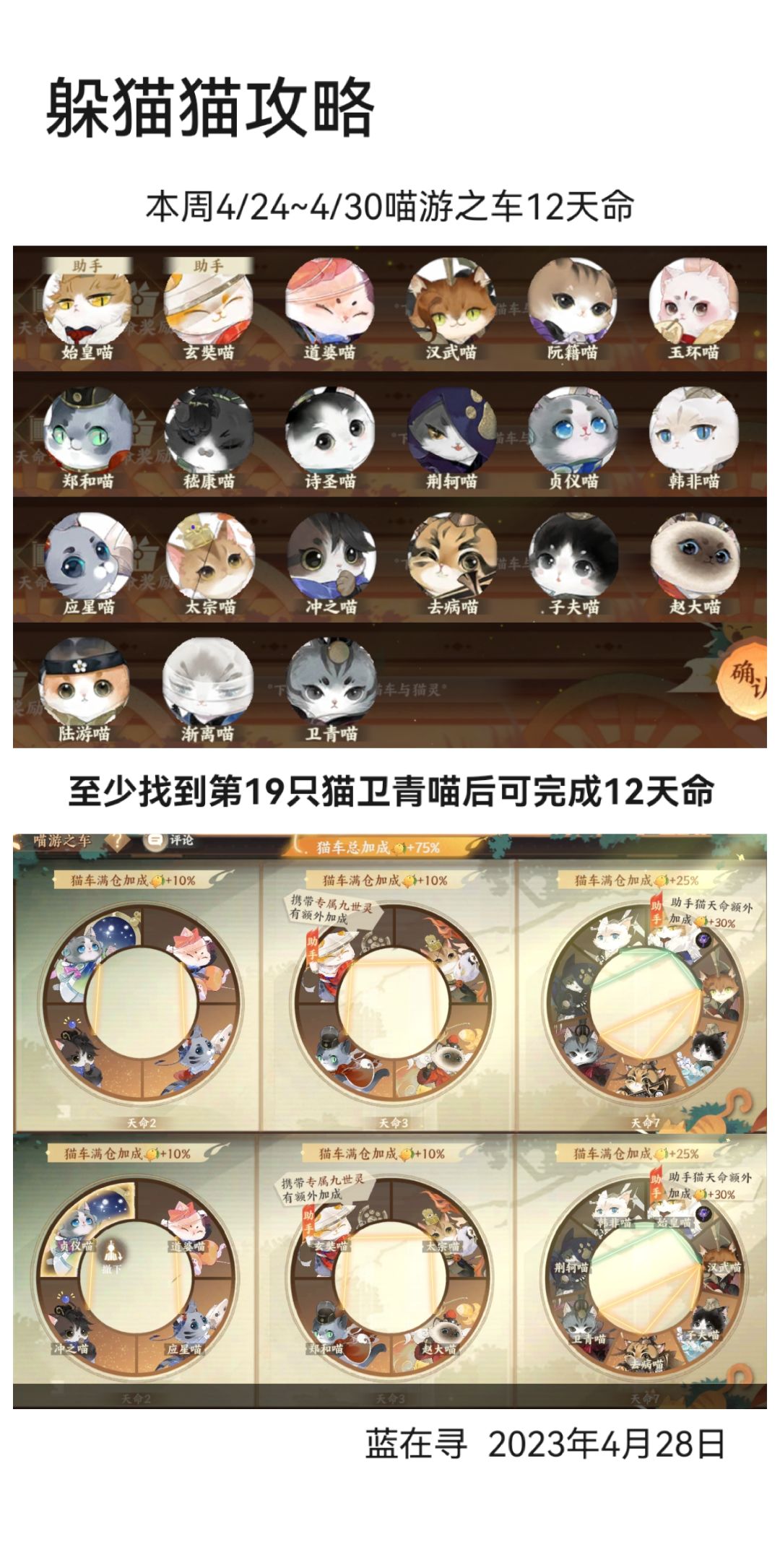 本周4/23~4/30喵游之车12天命 至少找到第19只猫卫青喵后可完成 【躲猫猫】全攻略传送门 玩法解读→https://www.taptap.cn/moment/336829366610693982?share_id=d7b531c08bc6&utm_medium=share&utm_source=copylink 线索整理→https://www.taptap.cn/moment/34680