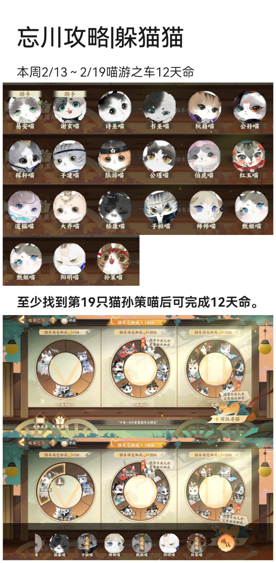 本周2/13~2/19喵游之车12天命 至少找到第19只猫孙策喵后可完成 【躲猫猫】全攻略传送门 玩法解读→https://www.taptap.cn/moment/336829366610693982?share_id=d7b531c08bc6&utm_medium=share&utm_source=copylink 线索整理→https://www.taptap.cn/moment/34680