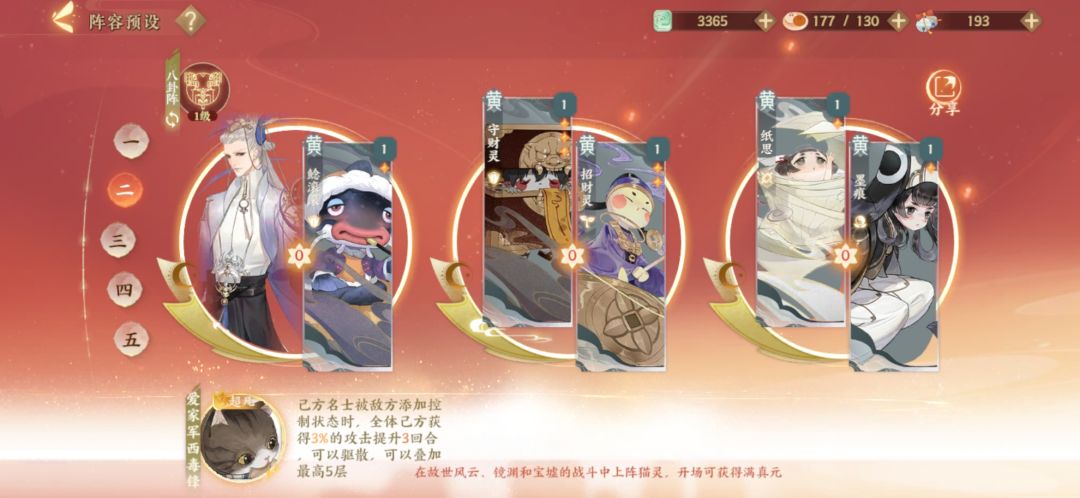 看到很多人在问阵容,为了避免新手走歪路,我这里推荐一套版本最强阵容 –––– 守财灵作为这套阵容的t,嘲讽是同类卡中最强的 –––– 招财灵虽然面板很垃圾,但是他的技能可以说是在众多辅助卡中脱颖而出 升到5星后,二技能复活无cd释放,大招不仅可以回血还可以解debuff,可以说这才是奶妈 –––– 墨痕的面板比较中庸,但是他的技能可以说是可圈可点 2技能可以提高整体的行动速度,大招更是给全队打火