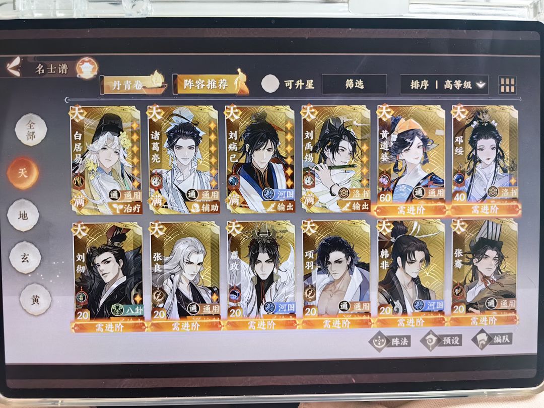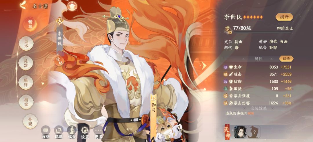 🐬开局推荐🐬 李白 前期很强,单体点杀。被动加攻击或者加防御。打宝墟很有用。(天命推荐杜甫或者杨玉环) 李世民 伤害分叉。他可以是个单体,也可以是个群体。属于万金油天卡。(天命推荐王羲之。更容易获取。有其他天命也可) 武则天 伤害增伤。伤害溢出转移。单体点杀(天命推荐上官婉儿或者太平公主)最好两个都养(没有杨玉环。那婉儿的奶量就很大。给她一套攻击踏破。) 嬴政 群攻。击杀加攻击。推故世本更好。宝墟