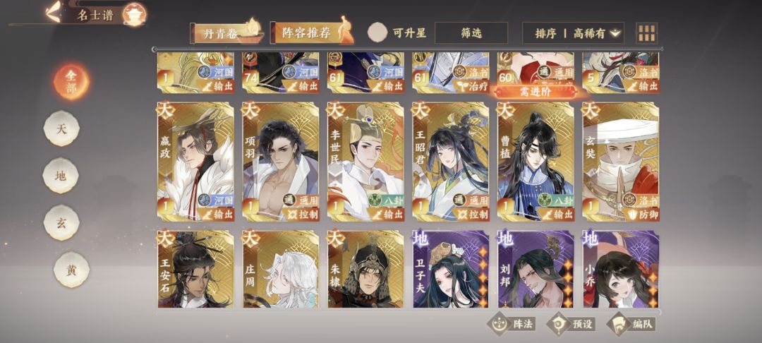 解析玄级名士(辅助篇) 本文将对以下【辅助】名士进行介绍: ❶ 【绿 珠 —— 保护队友、交换生命】 ❷ 【毛延寿——限制敌方、全体减疗】 ❸【许贞——保护队友、伤害减免】 ❹【大周后——提速神器,前期必备】 ❺【袁天罡——打火神器、前期必备】 ps:辅助很重要,尤其玄级辅助其中有许多技能使用有奇效! ▲辅助能力排行: 【大周后】>【袁天罡】>【许贞】>【毛延寿】>【绿 珠】 一. 【绿 珠 ——