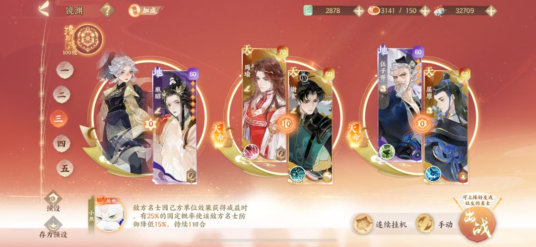 【图片是嬴政的建模,超绝芒果脸】#忘川风华录攻略 一。“玄局”这个副本是用来干什么的? 操作模式:主界面→三途海→玄局 简单来说,这个副本就是用来升级阵法的,获取的资源叫做“玄元精魄”反正很绕口就对了,就叫他元元吧, 那么它有什么用呢? 首先就是提升上阵成员的基础属性,也是提升练度的重要途径,也就是攻击防御生命,每个阵法上限120级,越到后面需要的资源越多,几乎是一周才能升一级,所以建议前期养一个