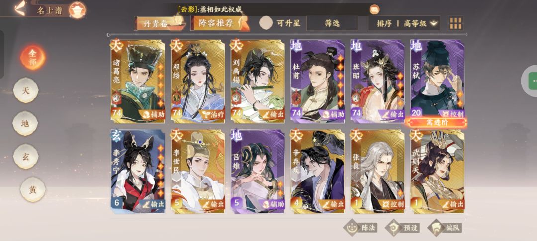 强度根据出伤能力/变阵能力/生存能力等维度综合排名,同等级内强度自上而下递减,所有强度仅代表个人看法,仅供参考。 【新手规划篇】 考虑到月底会出新名士,届时是会出一个新区的,刚刚入坑的宝宝们可以等到那个时候去新区认真养号。在此我先为平民玩家简单规划一下开号路线: 平民配队方面: 建议刷一个带白居易的初始号,然后新手池选李白,李白白居易天命PVP和PVE都无脑强,不仅能帮新手顺利度过开荒期,