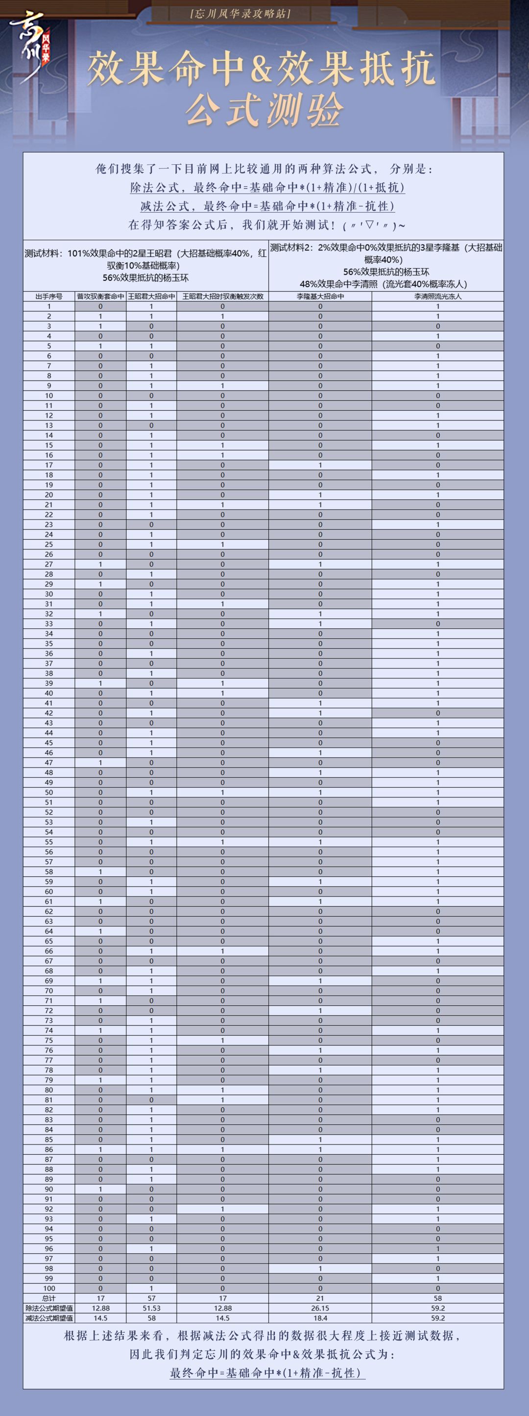 先直接说结论:最终命中=基础命中*(1+精准-抗性) 测试起源于在网上搜到的比较靠谱几个的效果命中公式,再经过一波实战数据对比(前后大概600组数据),最后得出上面那个公式是最接近的 但是一般游戏的机制公式都属于游戏机密,站站只能做个大致的猜测,可能也不太准确,如果有更好的公式见解,欢迎各路大神前来指导,我们一起学习!