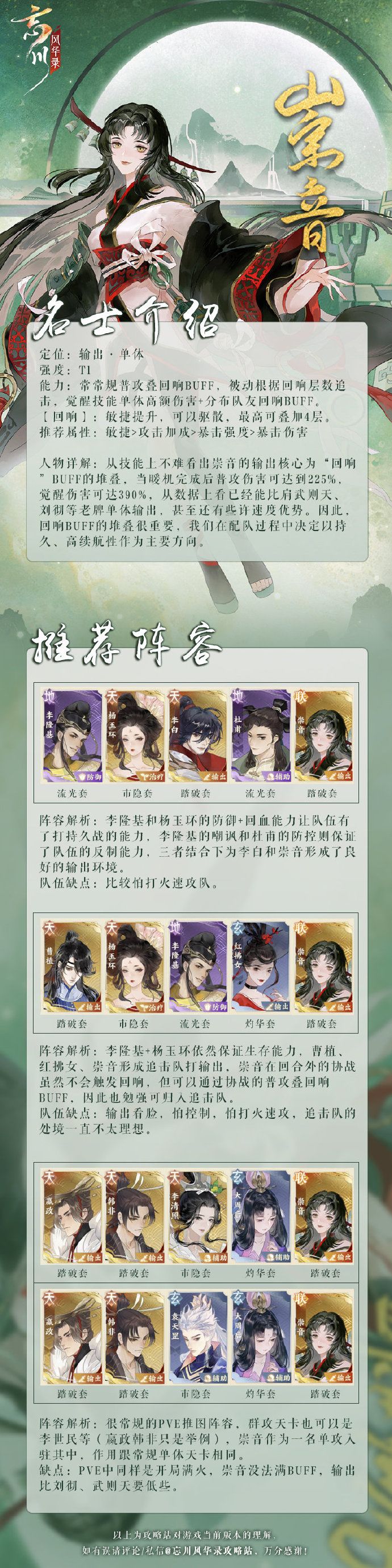 崇音在定位上属于一名中上水平的单攻输出,战斗中有着一定的暖机需求,且会因为大招的释放进行重复暖机,比较适合肉队打持久战。 唯一遗憾的是没有名士猫,跟常规天卡相比弱了一头,卡池里没有优质天卡单攻的使君可以考虑养一下。