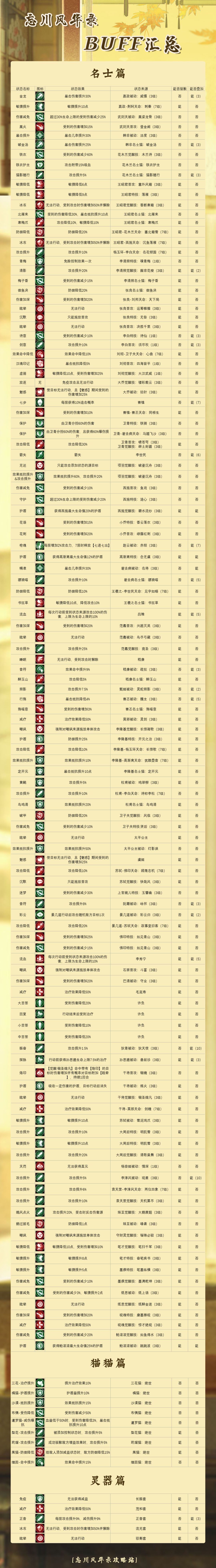 在众多粉丝的催更下,终于肝出来了!这张表是根据名士、猫猫、灵器可能产生的所有BUFF做的汇总,相同BUFF图标的来源不同,效果可能也会不同,大家可以仔细参考一下~PS:由于游戏的BUFF实在过多,俺也不敢保证是否真的收集全了,如果有遗漏的麻烦大家评论或私信告诉我,能提供遗漏的BUFF图片就更好了!欢迎大家来查漏补缺~