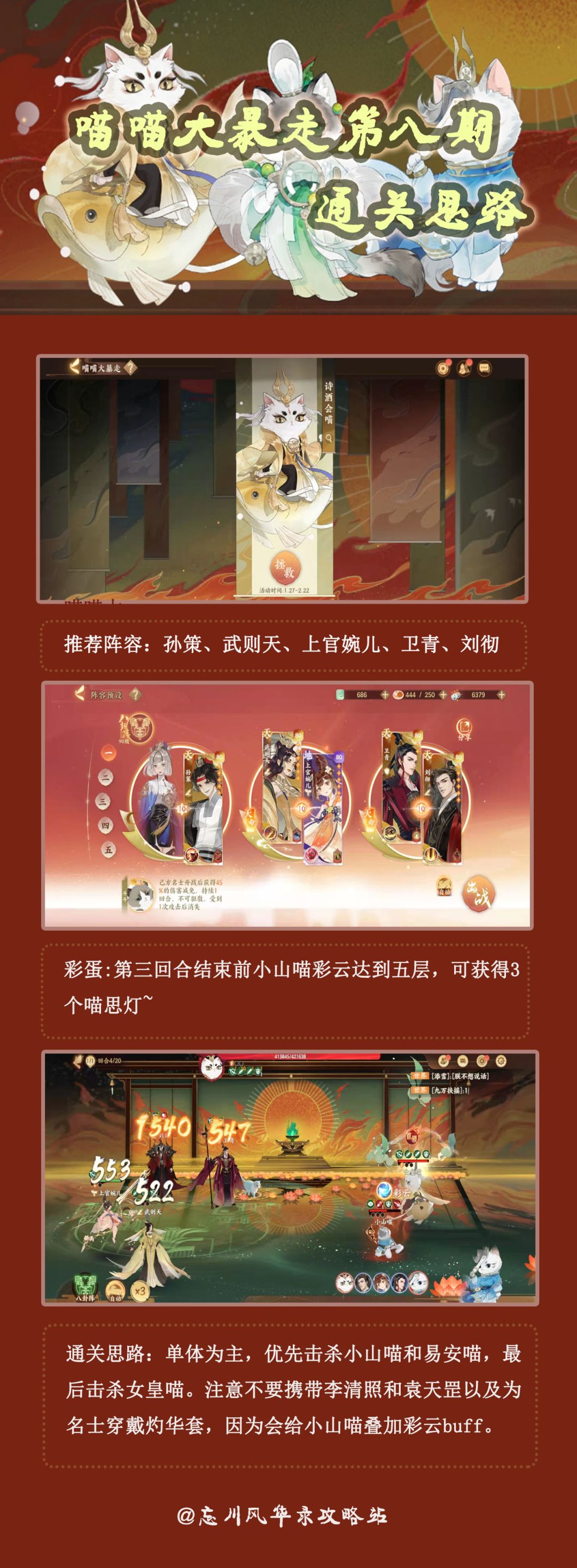 主要任务是将4只猫猫带到他们喜欢的玩具边上,后面的清除煞气顺序可以按照攻略上的点,如果点乱了的话后续可能会比较难收场(因为需要重新算一算),或者重新再走一遍剧情重置煞气。