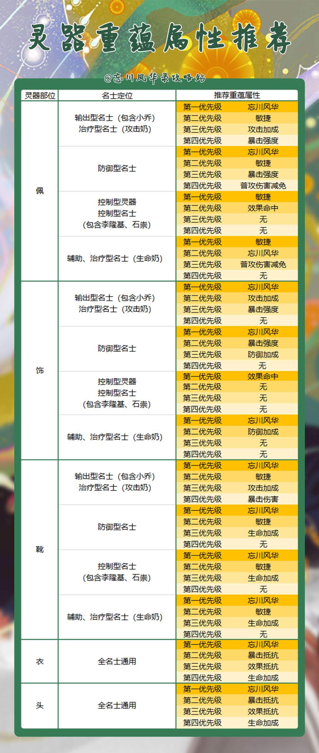 应大家要求,这份灵器重蕴属性推荐也完成了!推荐思路是根据大部分名士的属性需求制作的,可能对极少数名士来说不太适用,大家抱着参考的态度即可~ 如果对部分属性推荐有更好的建议也可以通过评论/私信指出,我们一起讨论研究! (PS:考虑到辅助型名士也可以佩戴流光套、捭阖套等,因此额外加了一类控制型灵器)