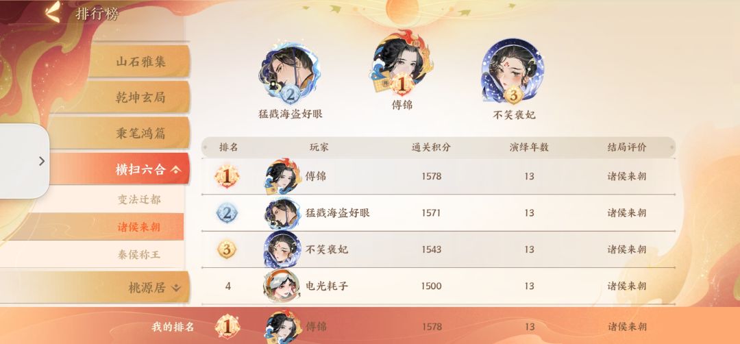 【横扫六合】诸侯来朝 攻略 先上得分,我果然是父皇最机智的崽儿😎 一些注意点: 1.防御事务多派点兵,城池掉了就意味着要重新来; 2.名显一方时间点之前需要注意军力和两次连横周国。 3.太子犯法的回合要招募军力高的人才,在下一回合替换被处死的公子虔。 4.后期有粮有钱就可以招募兵马攻打义渠。 p2攻略 不过也会有一些意外,比如掉城池,比如脸黑负面事项太多会导致粮草或者金钱不够。试了几次感觉是比较容易过/得高分的方法。 ———————————— 帮朋友打的。 更新:攻打义渠的时间提前避免民心不够 打完义渠之后,只需要注意目标军力即可,可以一直做内政,不需要完全按攻略来攻打其他城池 p3p4更新后