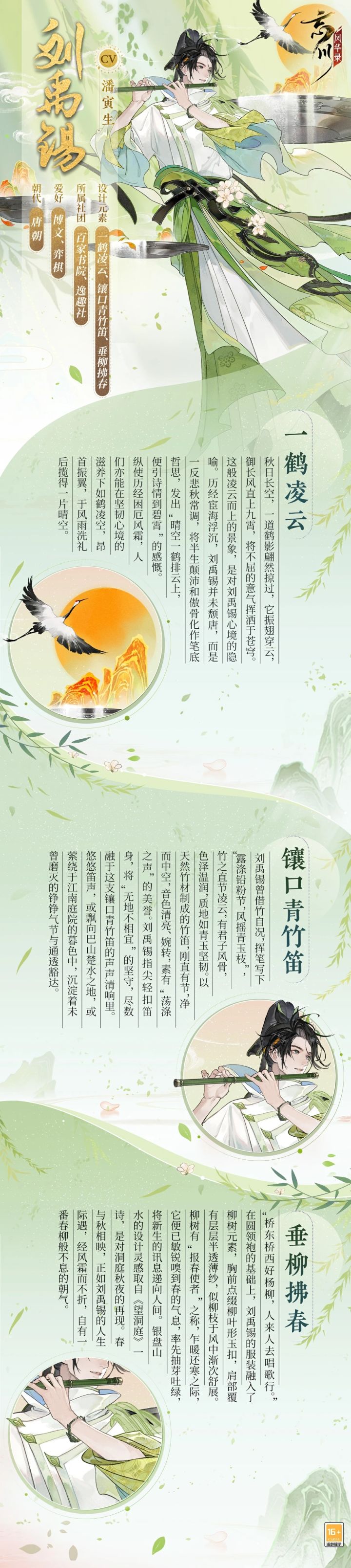 刘禹锡,字梦得,世称刘宾客。唐代文学家,有“诗豪”之称。刘禹锡笔含民生疾苦,文藏哲思妙悟,与白、韦并称 “中唐三杰”。他咏秋,不染萧瑟之气,但见仙鹤凌云;叹老,未显颓唐之态,尽览丹霞映天。刘禹锡来到忘川后,携诗卷寻朋会友,与乐天等人杯酒言欢。酒酣兴至便临风横笛,笛声若流风拂新叶,往来名士闻之纷纷驻足。全新天品名士刘禹锡将在1月8日来到忘川!#忘川风华录 #忘川风华录手游 #游戏推荐 #发现好