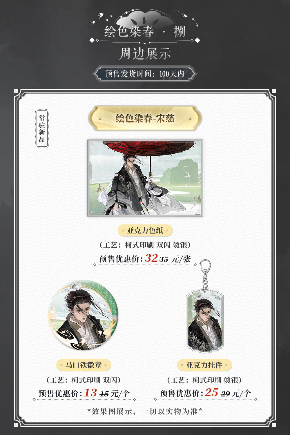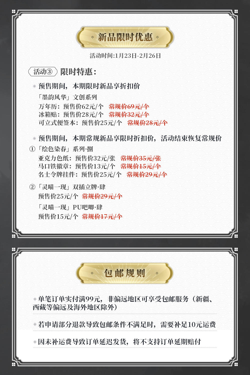 ※开售时间:1月23日14:00购买方式:淘 宝搜索“忘川风华录手游周边商城”,选择“店铺”分类即可进店选购△限时预售商品:「墨韵风华」文创系列万年历立牌、立牌冰箱贴、可立式便签本预售时间:1月23日14:00-2月26日23:59△常驻商品「绘色染春」系列亚克力色纸、马口铁徽章、名士令牌挂件「灵喵一现」系列亚克力双插立牌、PU马口铁徽章【限时优惠活动】※活动时间:1月23日14