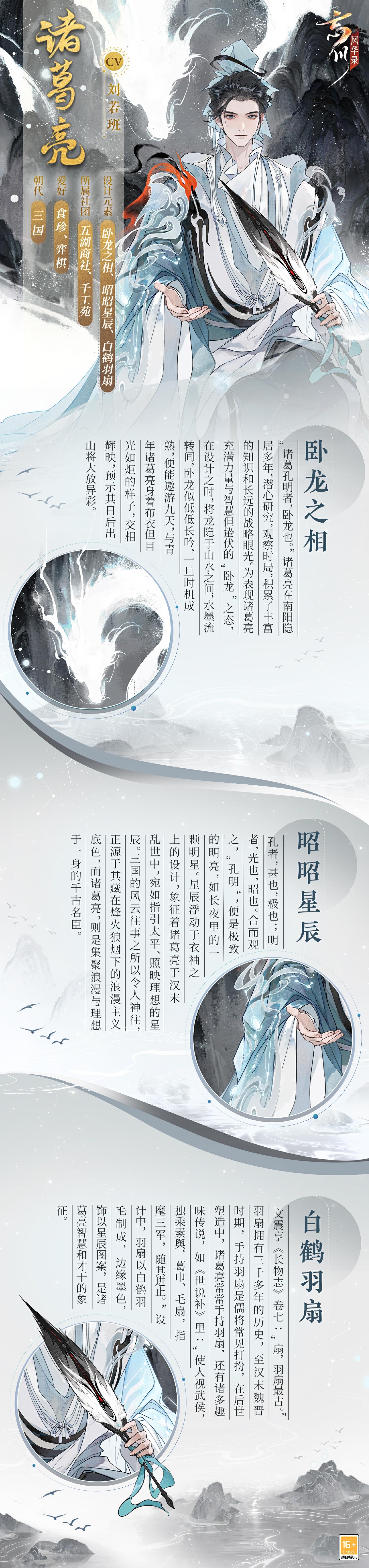 诸葛亮,字孔明,号卧龙,三国时期蜀汉丞相,中国古代政治家、军事家、战略家、发明家与文学家。诸葛亮躬耕南阳,应刘备三顾之请出山。他巧取荆襄,奠定蜀汉基业,严明法治,使蜀中百姓安居乐业,出则为帅,入则为相,一生鞠躬尽瘁,赤诚之心昭然在目。诸葛亮来到忘川后,待人亲和温润,有问则剖玄析微,尽心为众人答疑解难。他闲时喜爱琢磨奇巧发明,还邀使君一同细细赏玩。全新天品名士诸葛亮将在2月5日来到忘川!#忘