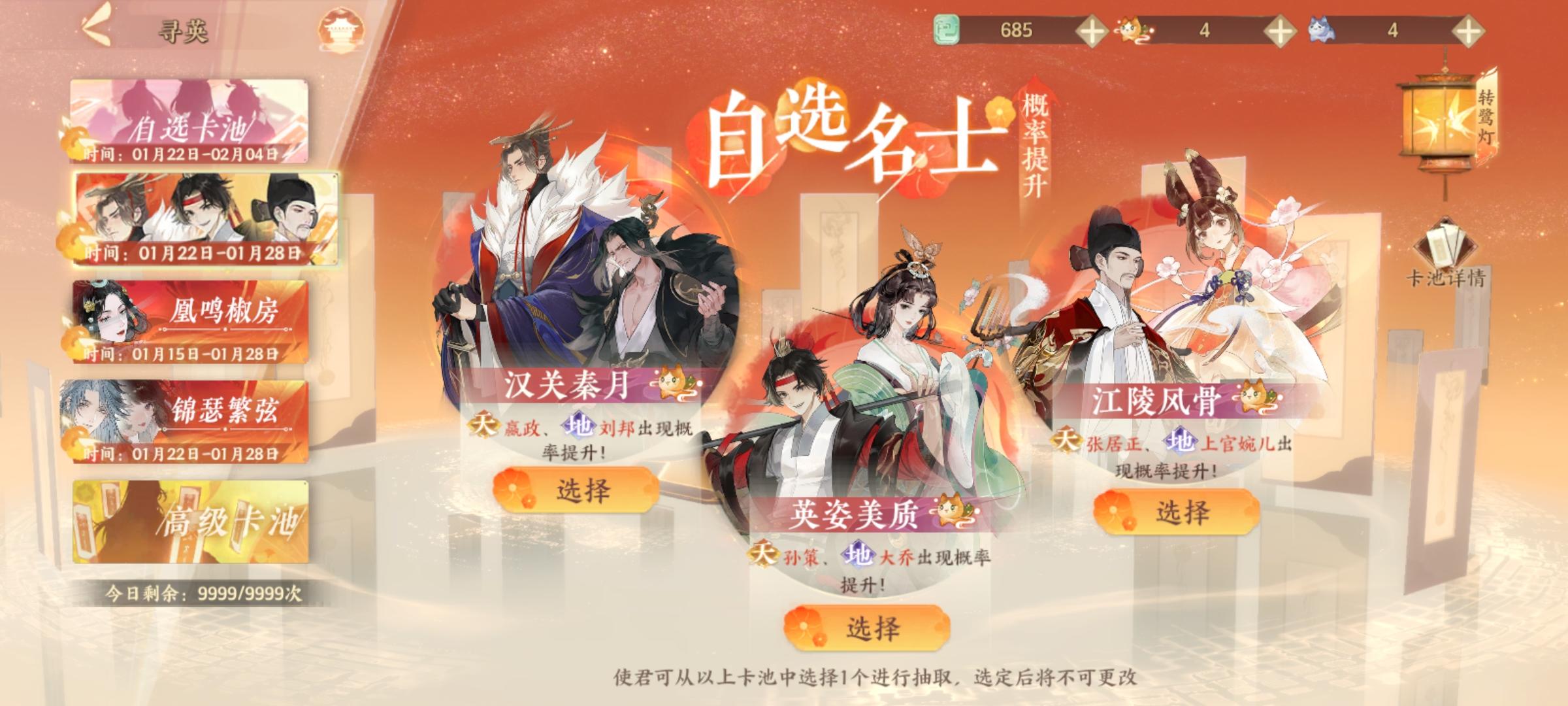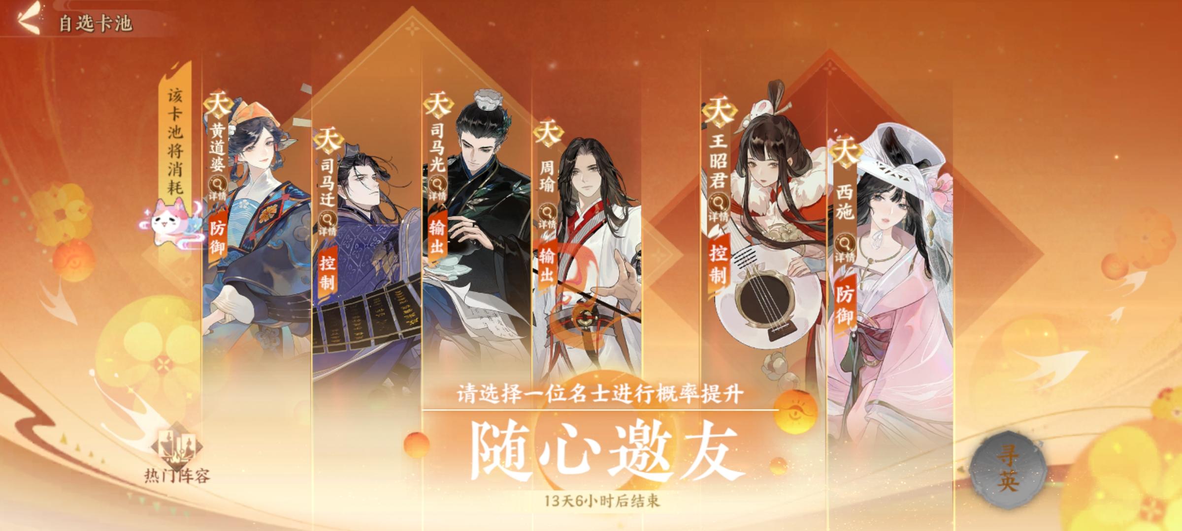只是简单的开局指南,从入坑开始说。1、新手推荐用政非开荒(即嬴政、韩非),开局自选池子选韩非,欧的话一发入魂,非的话第30抽必出。2、韩非到手后会出3个活动up池,先抽嬴政池(他是阵容核心,优先主养),欧的话一发十连就中,非的话歪两个天 第三个必定是嬴政。注:新手抽出自选后抽卡界面会变成这样↓,两个活动up池+一个7天嬴政池,其中活动up池角色有新出的也有老名士轮换的,嬴政池则是每个人都有的