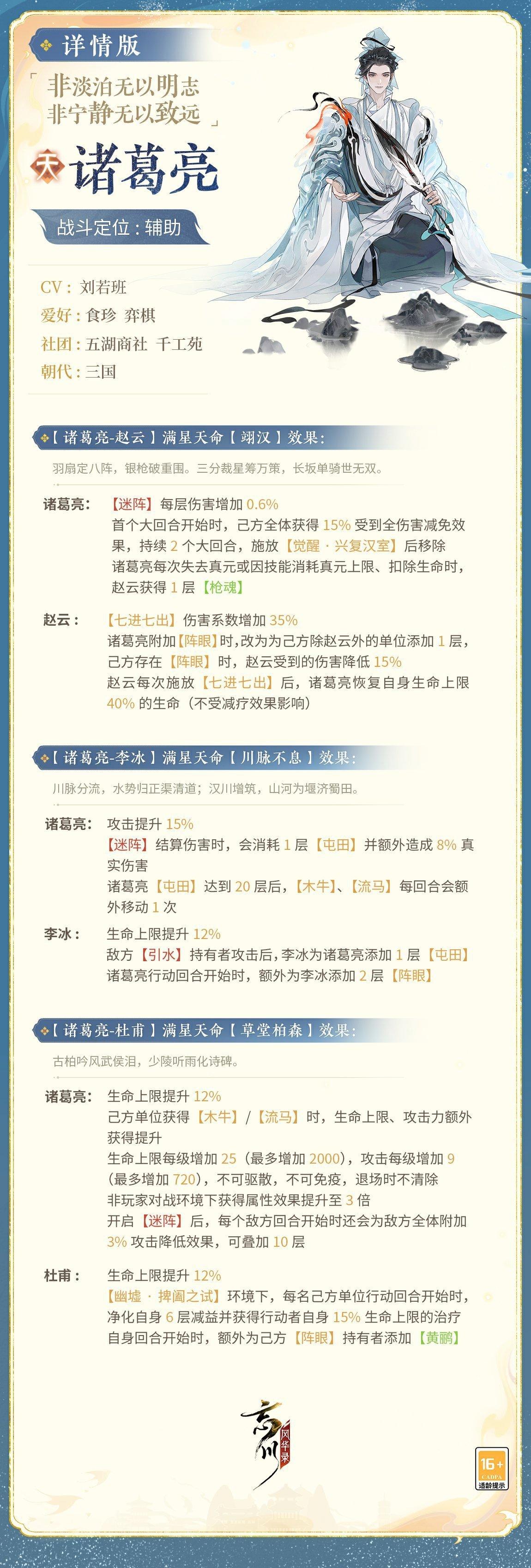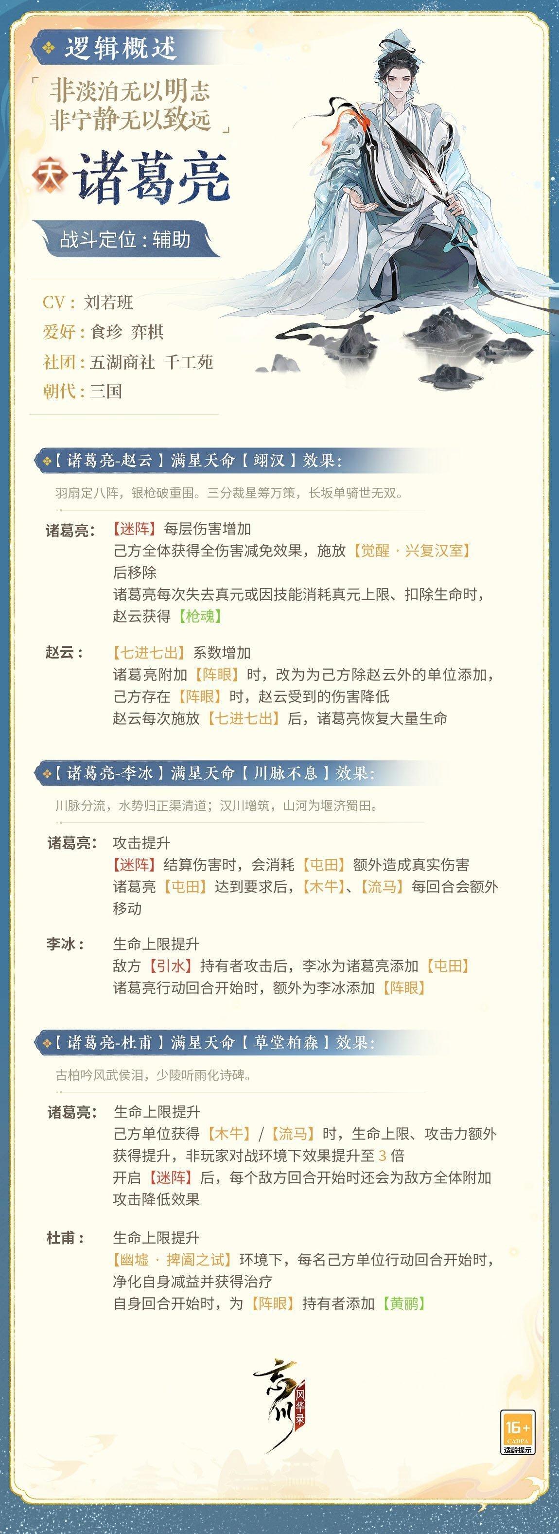 【新名士前瞻·技能曝光】全新名士・诸葛亮战斗技能曝光!“玉垒经纶远,金刀历数终。谁将出师表,一为问昭融。”诸葛亮经营蜀地、挥师北伐的过程蕴含丰富战斗元素,为技能设计灵感源泉。在忘川中,诸葛亮将作为辅助名士登场,使君大人可点击下图,共瞻孔明卧龙腾渊,匡扶汉室的志向!小麒麟抱来了详细的诸葛亮技能,使君大人快来看看吧!具体技能效果以上线实装为准哦~#忘川风华录 #忘川风华录手游 #游戏推荐