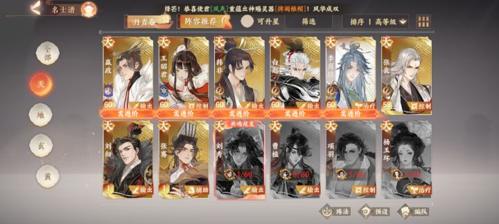 声明:本期pve不涉及具体的副本攻略,主要是关于名士的选择以及装备问题,不必严格要求对上,氪金就缩短时间,0氪就暂时延长。1.新手期:2个6星天卡2.进阶期:pve:5个6星天卡3.长草期:pvp:常用单系6星天卡。