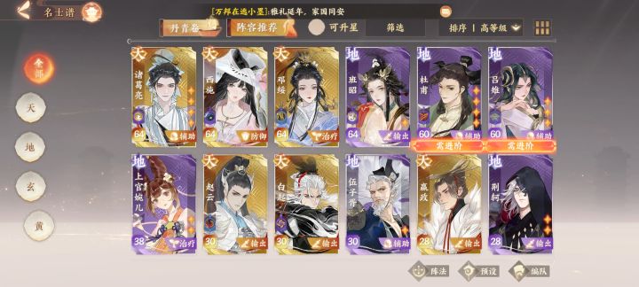 回坑小登请问下大佬,这是高星名士,其他还有四星的诸葛商鞅,其他都是低星了,想玩个金戈怎么配队呢?嬴政六星转给谁呢?