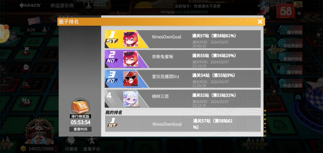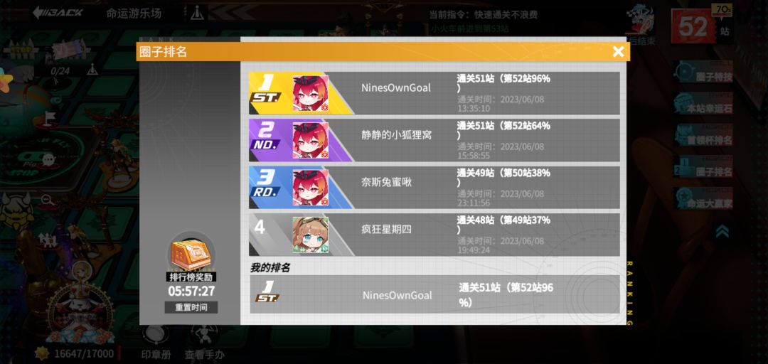 之所以要纪念这次圈战(命运游乐场)夺冠,是因为我们圈又破了记录,突破第56站。至此,支线任务中命运游乐场的全部奖励已经领取完毕(是的,你没看错,目前设置的最高奖励只到56站) 本期指挥依然是本叶和海棠(亲热),经历了这么多期圈战,我们之间已是非常有默契。但第一周本叶感冒不在状态,加上确实也比较黑,所以一开始没有和第二名拉开差距,但是大概第一周结束的样子,本叶的感冒好得差不多了,开始奋起直追,并在第
