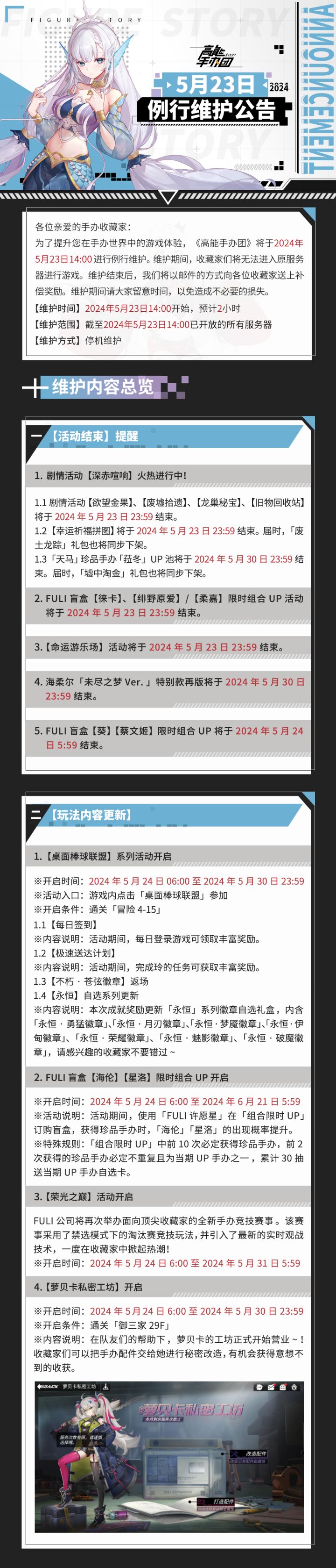 尊敬的收藏家们:我们将于2024年5月23日14:00对全区服进行停机维护,本次维护时长预计2小时。详细公告内容请点击下方图片查看