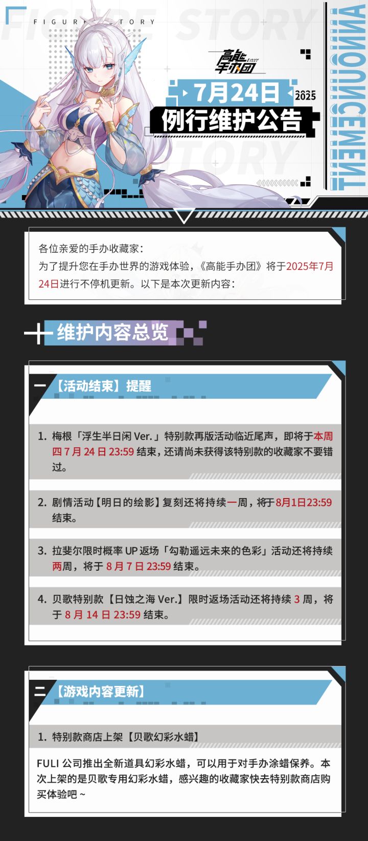 各位亲爱的手办收藏家:为了提升您在手办世界中的游戏体验,《高能手办团》将于2025年7月24日进行例行维护。详细公告内容请点击下方图片查看