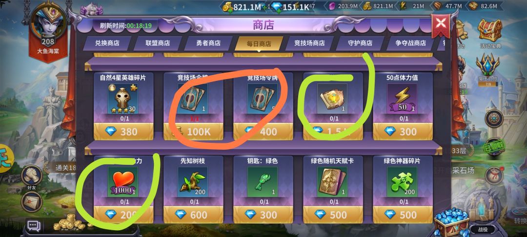 关于每日商店与守护商店该买些啥,以下几张图我圈了下,橙色必买,绿色看自身钻石情况。消费很爽,但不要耽误自身升级守护等级哦。本人微氪玩家,以上为自身理解,不喜勿喷,欢迎各位评论区留下自己的见解。