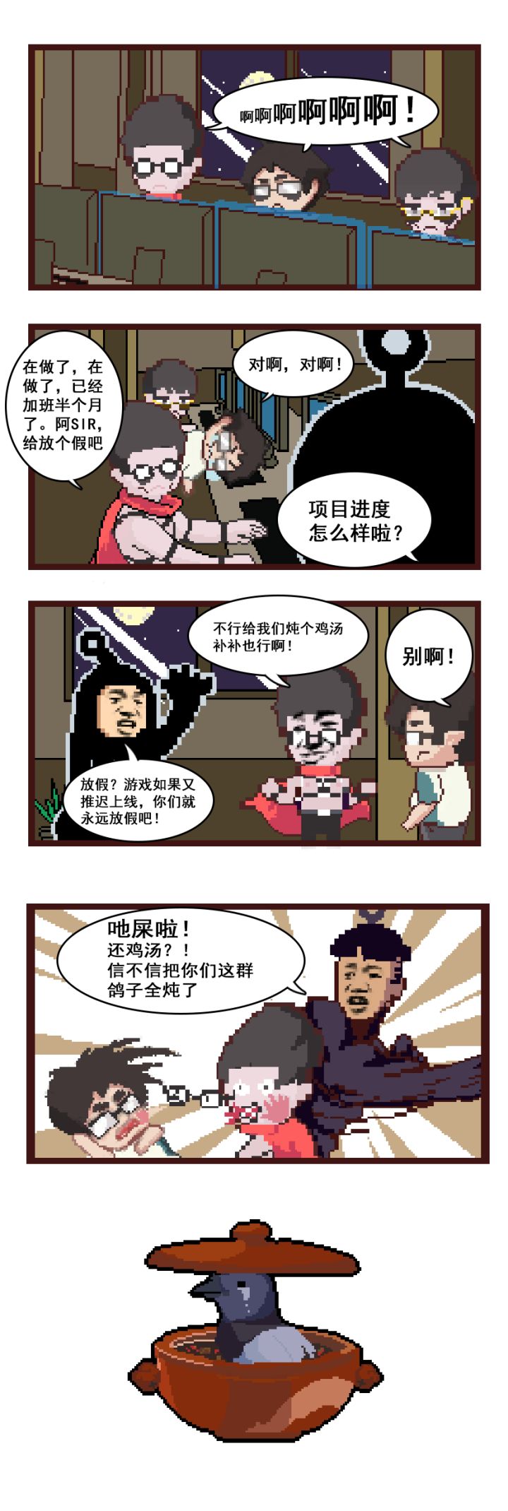 为了游戏能够如期上线,整个项目组真是拼了老命了。掐指算一算,研发组的小伙伴们已经连续加班半个月以上了。非常恐怖,兄弟!真害怕那几个程序小伙敲着敲着代码,突然间就嗝屁在电脑前了。。。。。不过不用担心~ 就算真的挂了,也会被我从棺材里拉出来继续敲代码,保证不咕!都来看看我们现在是怎样的工作状态:这flag就立下了.........下次再跳票,研发组全员做成鸽子汤!!!