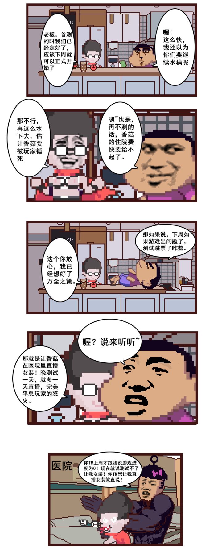 正所谓,常在河边走,哪有不摸鱼。前两天一直在忙着给各位老公们发关于首测公告的帖子,还有回复你们的提问,搞的我心力交瘁。你们这些天天搀着我身子的人,终有一天,会有如愿以偿的。今天是关于交叉人物大放送的最重磅一期,刚刚在厕所终于抓到那个想让我直播女装的策划。所以然后这一期的人物大放送介绍,就还是他来给你们讲解,讲到有什么不合理的地方,或者回答不出我提问的话,呵呵。狗策划:嗯...是这样的,今