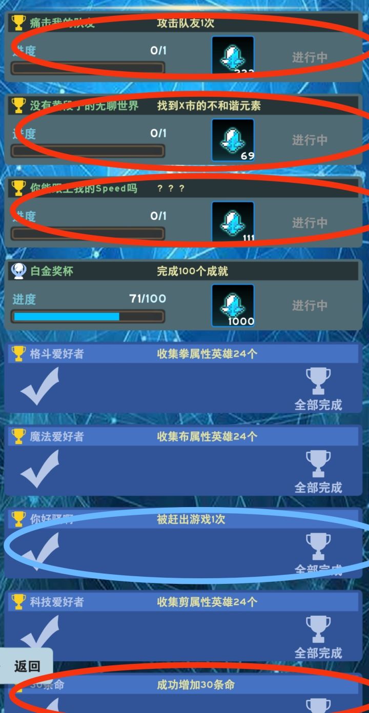 如题,以前从没有做过任何游戏攻略,这还是不才第一次做攻略,然而内容并没有什么营养,抱歉了各位!又是风和日丽的一天,俺,卡关了!但是又不想退游戏,那怎么办呢!我就研究这个游戏的各个角落呗!然后。。。。俺就发现了四个我没做过的隐藏成就!(红圈部分)而这里主要讲的则是我研究半天唯一完成了的奖励最少的可能我不用说大家也会的30条命的触发方法!(我果然没什么用,只能做到这样)废话不多说,下面干货↓