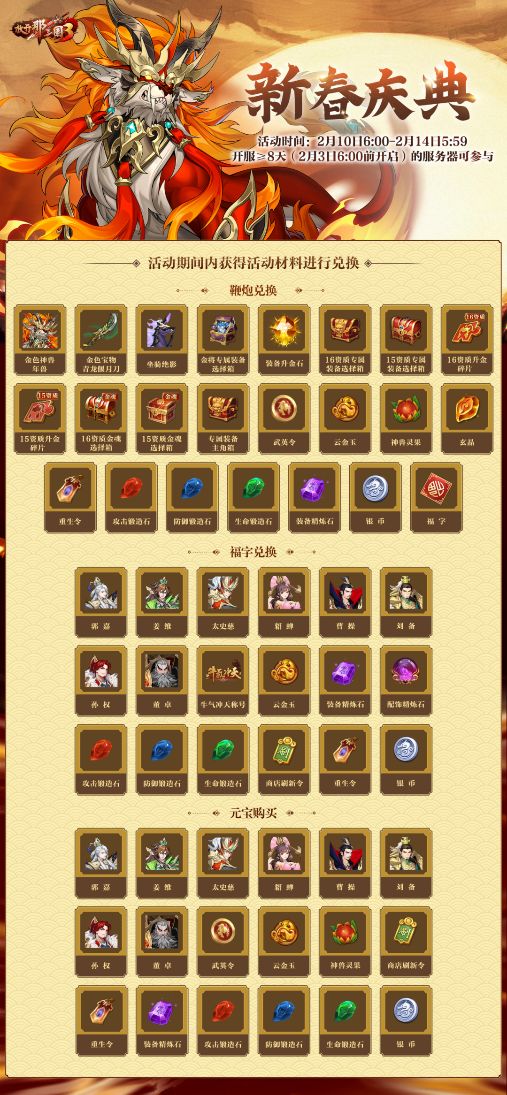 新春庆典 金神兽-年兽携金宝物-青龙偃月刀相庆 坐骑-绝影返场助阵 恭祝各位少主牛年快乐、万事如意 牛运当头! 新春庆典活动预告 活动时间 活动持续时间:2月10日6:00-2月14日5:59 奖励兑换时间:2月10日6:00-2月15日5:59 活动范围 开服≥8天(2月3日6:00前开启)的服务器可参与 活动说明 活动一、牛气冲天 福利任务 1、活动期间,达成指定任务目标,可获得道具「福字」 「