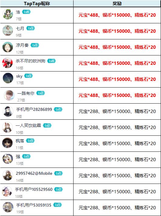 恭喜以下13位少主获奖! 请少主在3月1日18点前,添加官方活动负责人-吕小鸭(QQ:35765796),领取奖品! 逾期不领视作自动放弃,不再补发。 添加方式: 1、输入验证信息——【新年】+TapTap昵称。没有验证信息会被拒绝添加好友哦! 2、添加好友成功后,请向吕小鸭发送您TapTap个人信息截图。核实信息后,吕小鸭会给少主发放奖品。 注意: 非工作日(周六、日及法定节假日)和非工作时间(