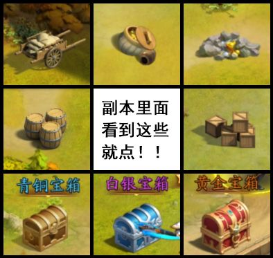 《放开那三国3》的功能是跟随推图进度开启的。开区后,你的推图速度越快,功能开启越早,战力提升也就越大,能够更快速的抢占更多的资源,这是一个良性循环。然而,同样的推图进度,为什么你的战力比别人低,资源比别人少?因为副本里除了推图,还有其他方面也可以获得大量资源,而你,忽略了它们。散落的资源副本地图里如果看到了下图这8种,一点要点它!点它!点它!这些不是场景里的装饰,这些是可以直接拾取的资源,点