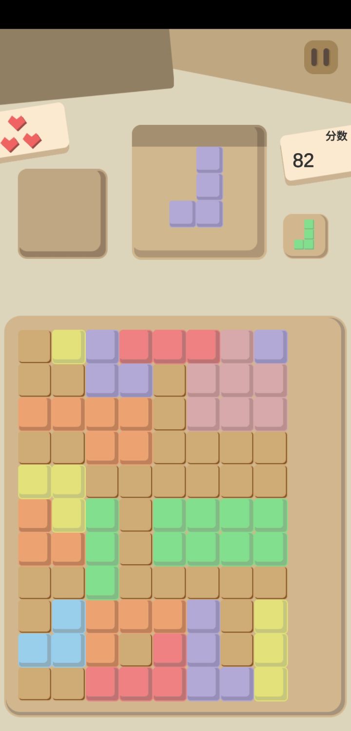 嗯……最后就是时间……这个游戏感觉,不需要时间吧?(个人感觉),有倒计时限制还是很难受的……三个心的设计也是一样,有的时候棋盘满了方块放不下去,又要等倒计时然后扣个心然后下一个,下一个还放不下去呢?继续等,有种也许第三个就放下去了的期盼……比较拖沓,结束吧又想试试,不结束吧其实也是垂死挣扎,要不你们一次性出三个方块放下面?取消时间,放不下就结束游戏?
