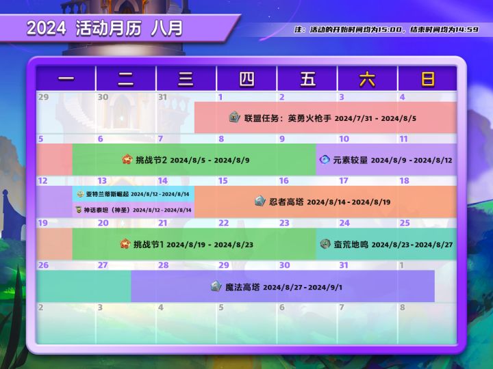 ◆ 活动排期 联盟任务:英勇火枪手2024/7/31 15:00 - 2024/8/5 14:59挑战节22024/8/5 15:00 - 2024/8/9 14:59元素较量(烈火)2024/8/9 15:00 - 2024/8/12 14:59亚特兰蒂斯崛起2024/8/12 15:00 - 2024/8/14 14:59神话泰坦(神圣)2024/8/12 15:00 -