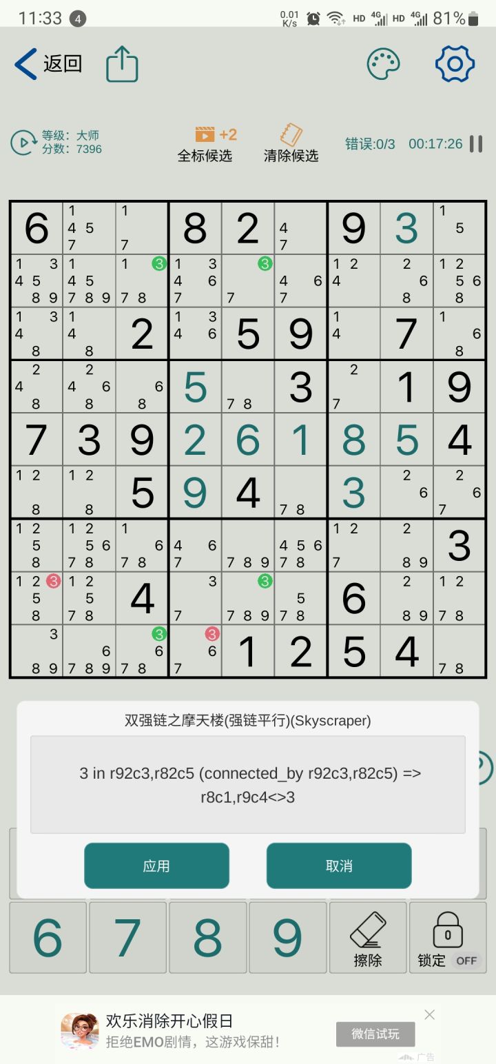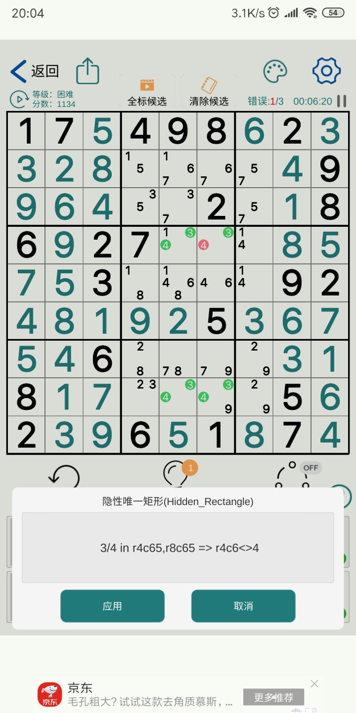 步骤: 1.无脑将所有空位填入所有数字(比如9×9,那就每个空位都填满1~9)。注意此步不要因为一些明显可不填的数字就觉得可以不填那些数字,因为全填的目的是给后续做减法用,这样便于区分哪些格子已处理及剩下哪些待处理等。 2.按固定顺序(比如先1然后2...一直到9、从左往右从上往下、先行后列的顺序。实际你可以按自己觉得更习惯舒服同时不失去可靠及确定性的顺序)依次将每个出题数字所在的组、行和列对