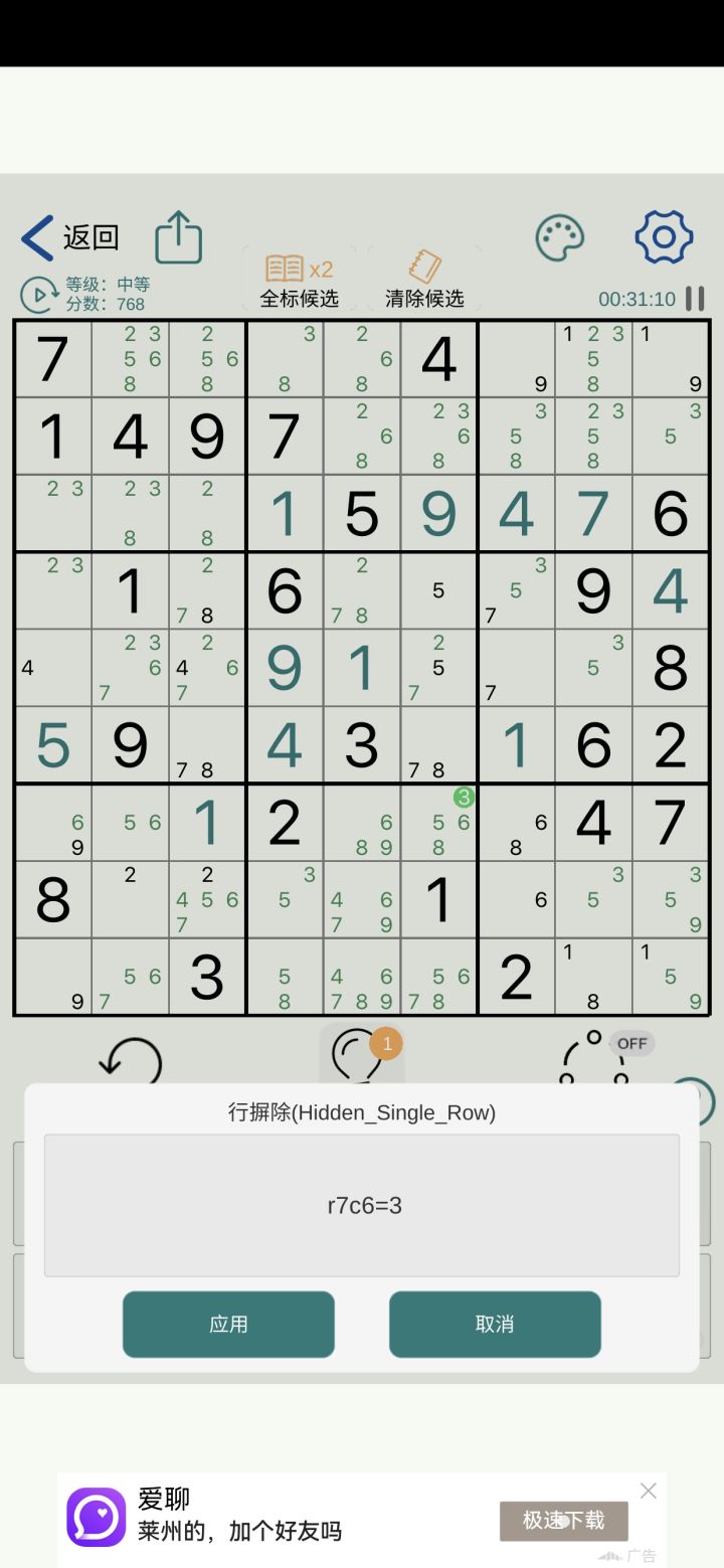 步骤: 1.无脑将所有空位填入所有数字(比如9×9,那就每个空位都填满1~9)。注意此步不要因为一些明显可不填的数字就觉得可以不填那些数字,因为全填的目的是给后续做减法用,这样便于区分哪些格子已处理及剩下哪些待处理等。 2.按固定顺序(比如先1然后2...一直到9、从左往右从上往下、先行后列的顺序。实际你可以按自己觉得更习惯舒服同时不失去可靠及确定性的顺序)依次将每个出题数字所在的组、行和列对