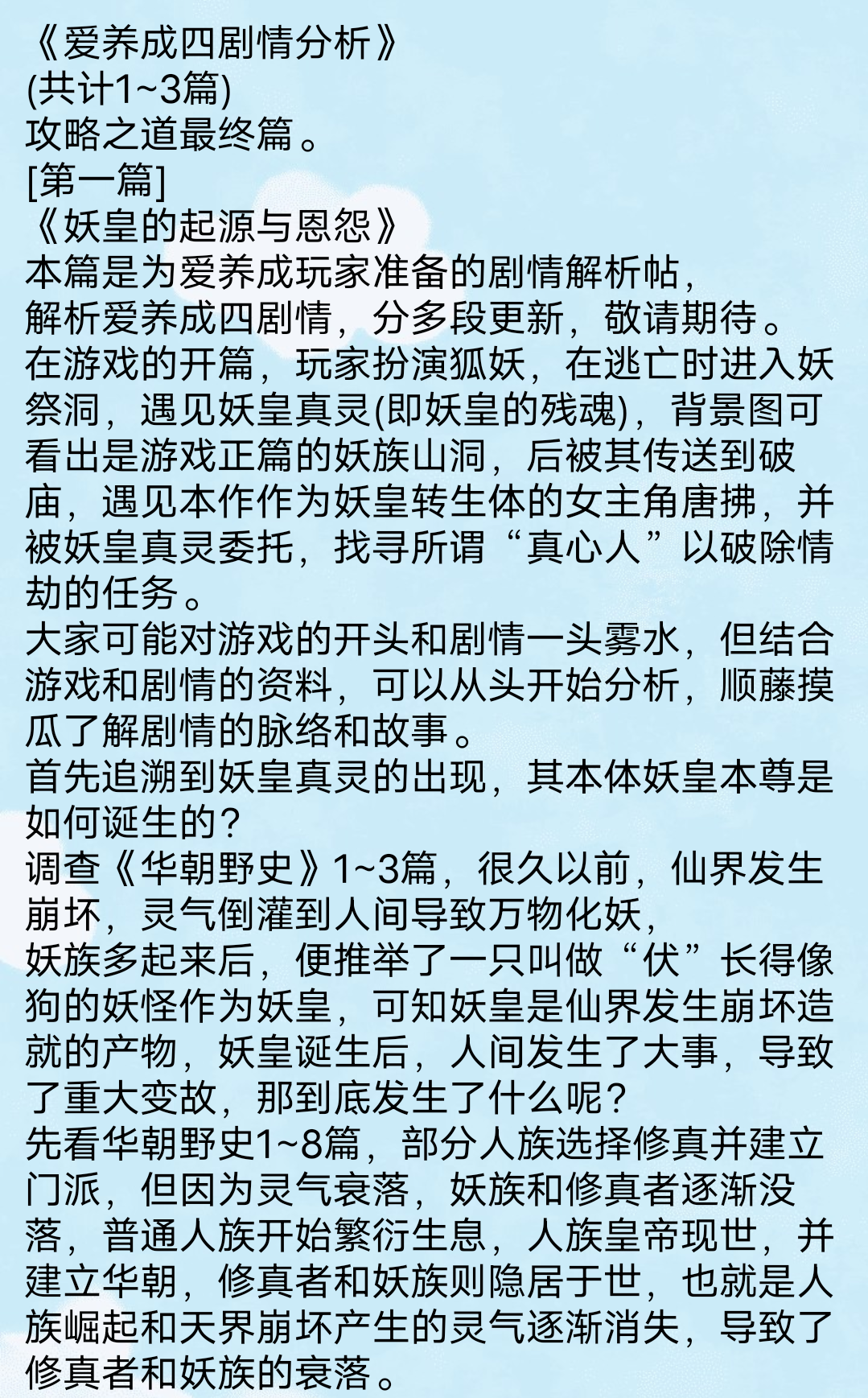 《爱养成四华朝野史翻译解读》1~9篇有一天,仙界发生了崩坏,灵气倒灌了出来,结果人间万物化妖,唯独人族坚守,开启了修真之路。(修真:学习道教天道修炼的行为)由于群妖四处崛起所致,秩序渐渐诞生了,有个名叫“伏”的妖怪,长得像狗,而且有一只独角,被群妖推举为妖皇。在同一时间,修真门派兴起,无法修真的人类,和蝼蚁没有区别。(蝼蚁:蚂蚁,形容弱小的人或生物)好景不长,灵气日渐衰退,妖族和修士们