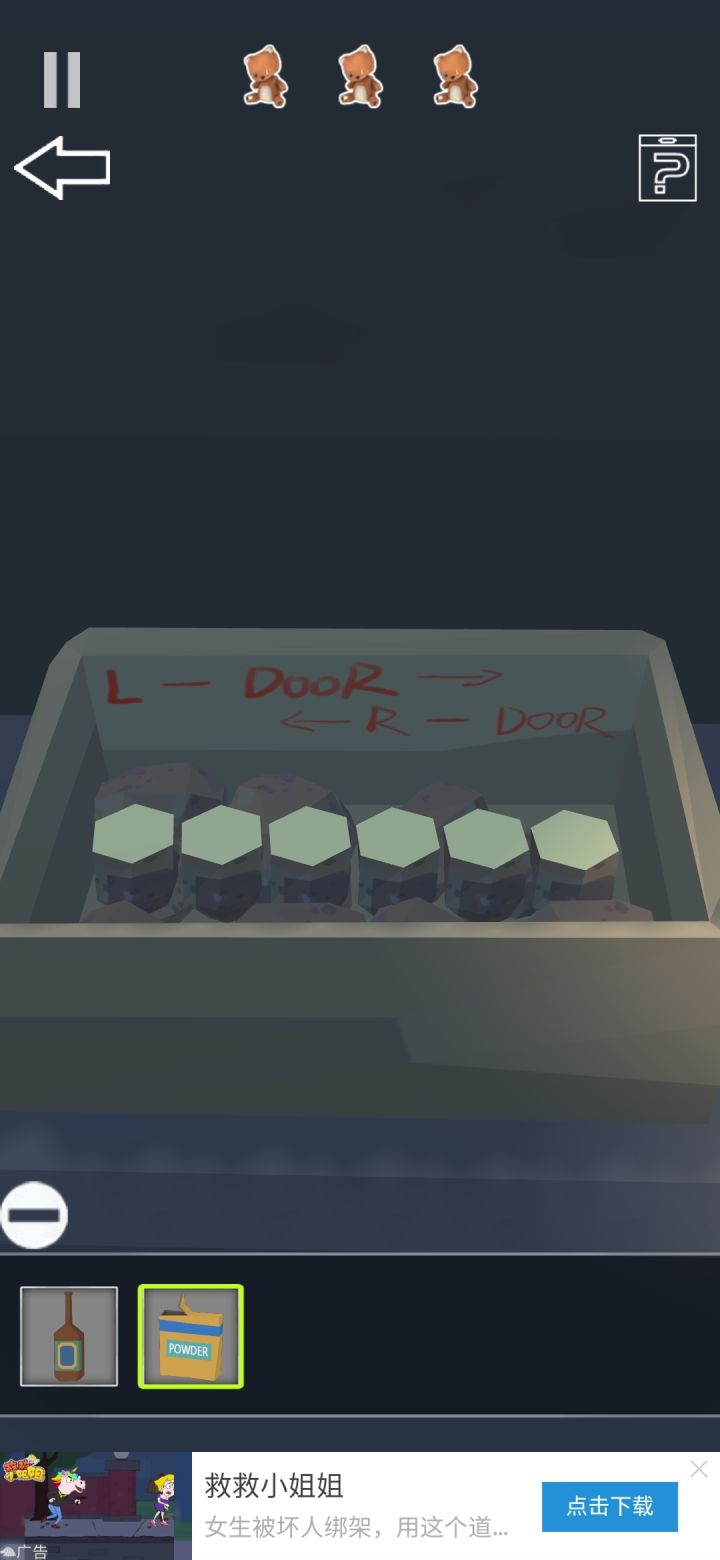 大家最心急的全攻略出来了!对!你没有看错!是全攻略!!-那我们废话不多说开始吧第一关:结束引导教程后,就会看到这些按图片拿到打火机,打火机是为了点燃火堆接着,我们看向汽车那个位置接着,我们翻转地图,来到房子后面然后按图操作然后再利用在箱子里获得的打火机点燃火堆接着,我们把得到的老旧腐蚀剂丢进火堆,获得新腐蚀剂然后,我们要去获得第三个小熊最后,我们拿着腐蚀剂,点击门口然