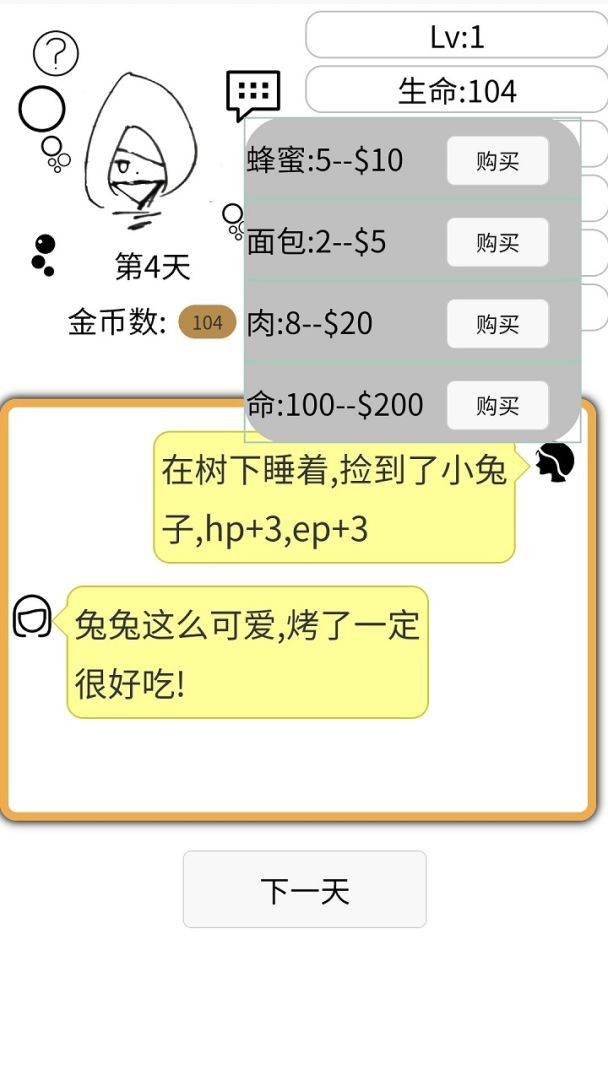 饱食度和魔力会随着时间下降2,遭遇不同的事件,得到武器和不同状态增减。 当生命值和饱食度低于零点,会迎来结局, 金币可以购买食物,点击对话框会更改对话。