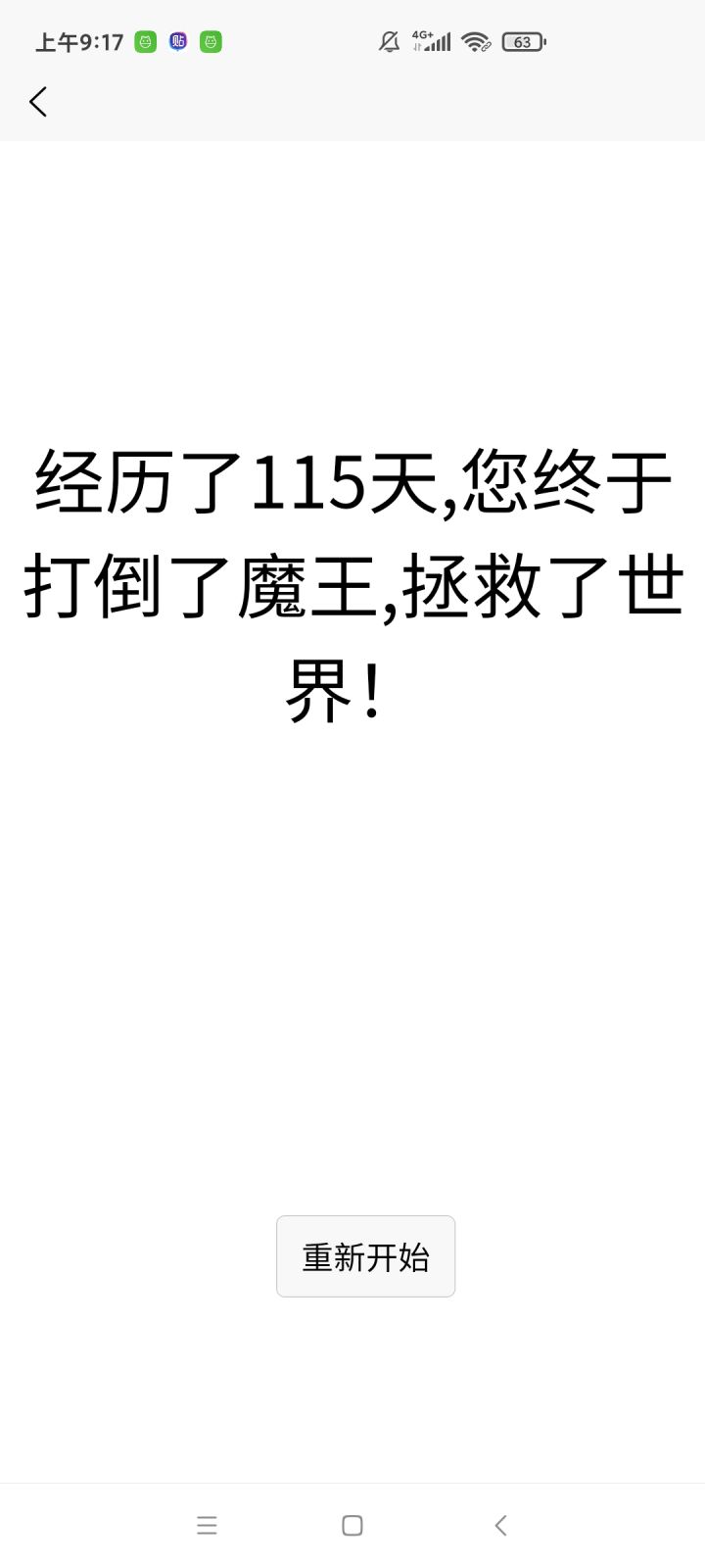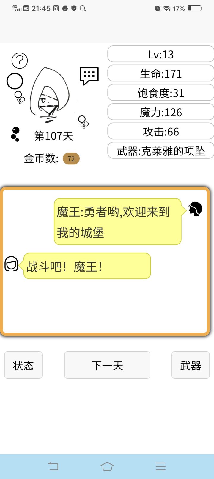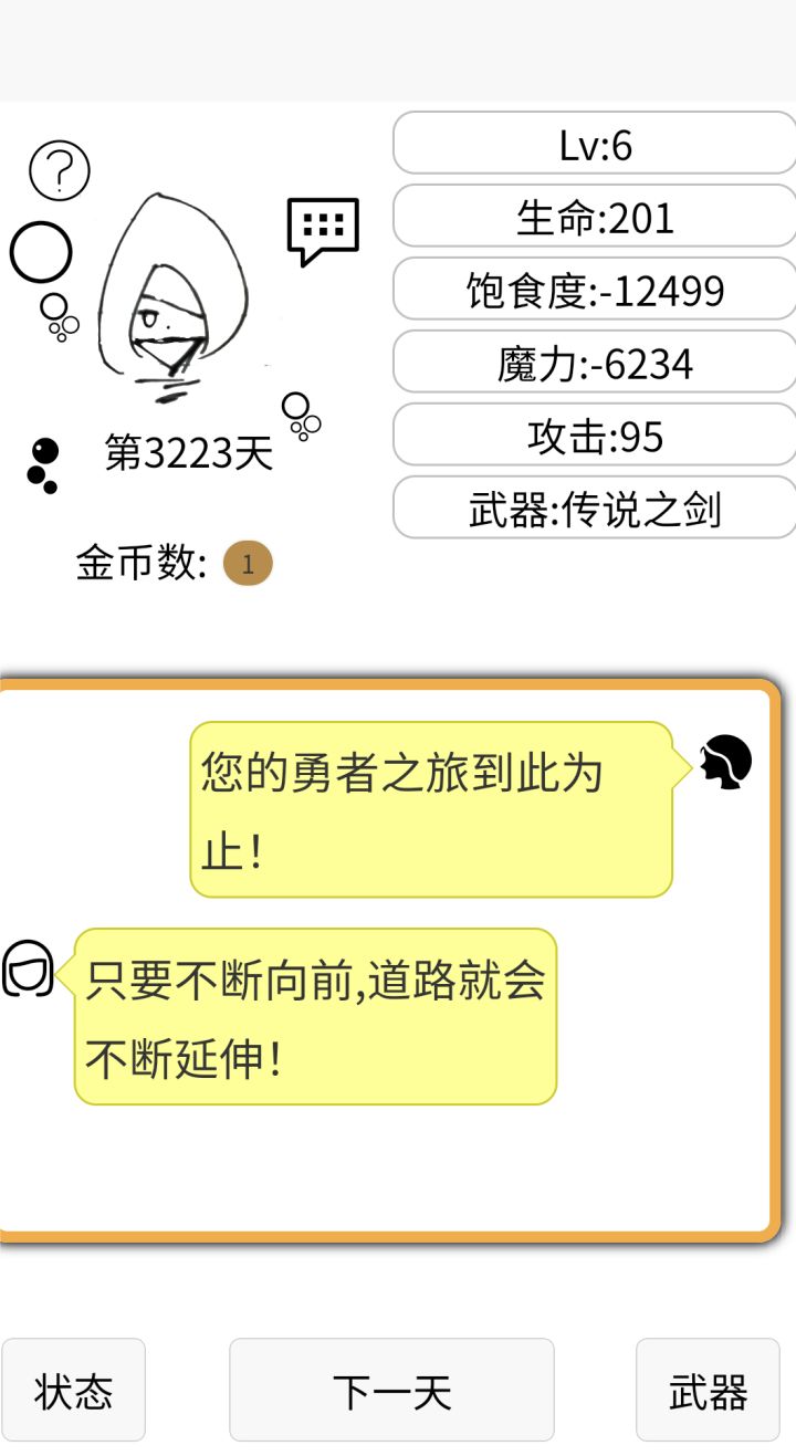 呼,花了有半个小时,总算把小屋结局刷出来了~游戏是个好游戏,就是剧情有些单调,玩法太过单一,最关键的是……魔导书后面都标了“初级”,结果到了最后也没有出现别的级别的,这不是折磨人吗……还有很多好玩的BUG,比如……战斗中假如打不过,又没有逃跑选项,可以直接点左上角箭头离开战斗,没有损失(除了类似贤者战的剧情杀),还有当你快速点击“下一天”,会有各种时间叠加在一起,出现各种奇葩对话、叠加按钮,还有……嗯,总之游戏的玩法创意都很好,希望能够继续更新下去吧!(下附我打出的结局图)