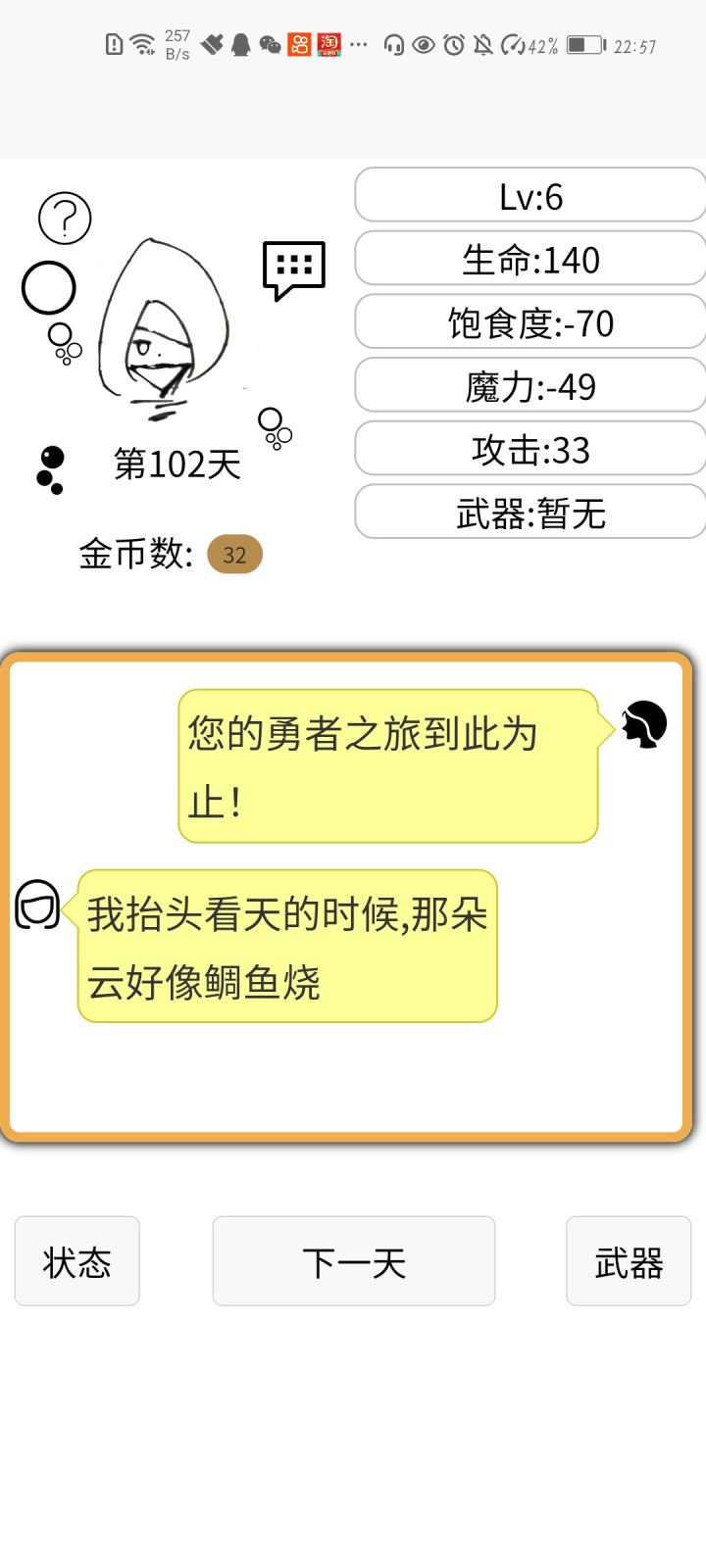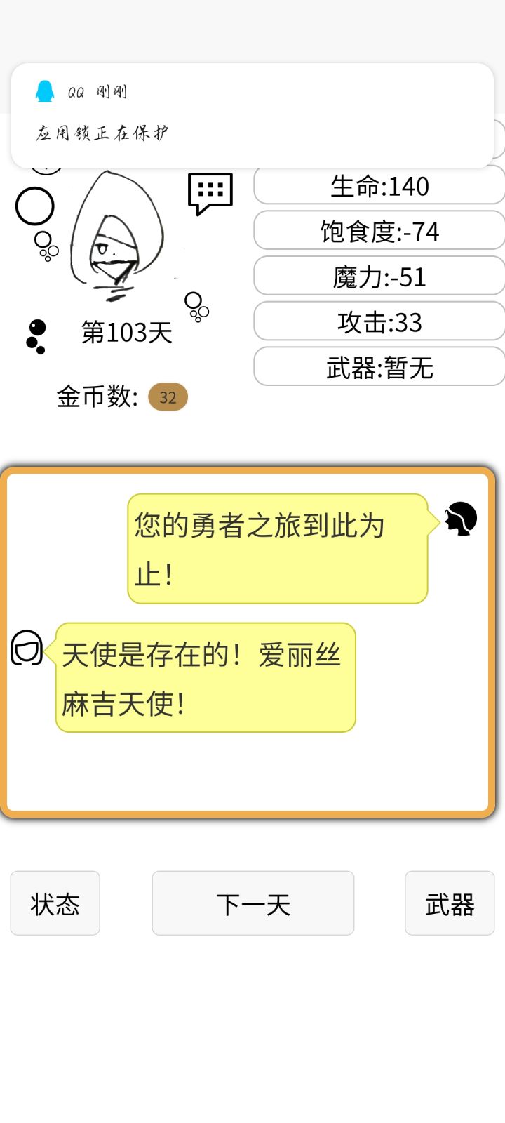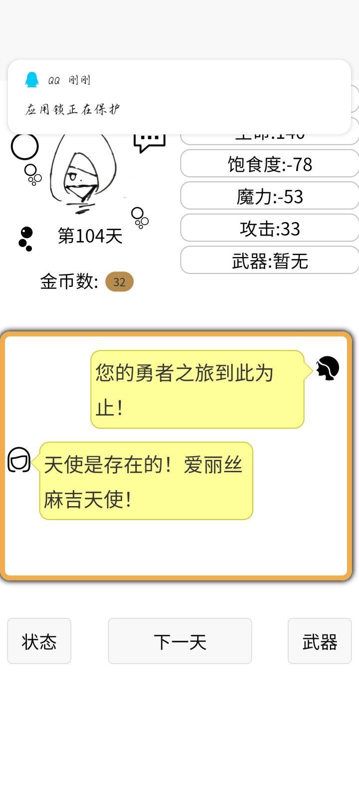呼,花了有半个小时,总算把小屋结局刷出来了~游戏是个好游戏,就是剧情有些单调,玩法太过单一,最关键的是……魔导书后面都标了“初级”,结果到了最后也没有出现别的级别的,这不是折磨人吗……还有很多好玩的BUG,比如……战斗中假如打不过,又没有逃跑选项,可以直接点左上角箭头离开战斗,没有损失(除了类似贤者战的剧情杀),还有当你快速点击“下一天”,会有各种时间叠加在一起,出现各种奇葩对话、叠加按钮,还有……嗯,总之游戏的玩法创意都很好,希望能够继续更新下去吧!(下附我打出的结局图)