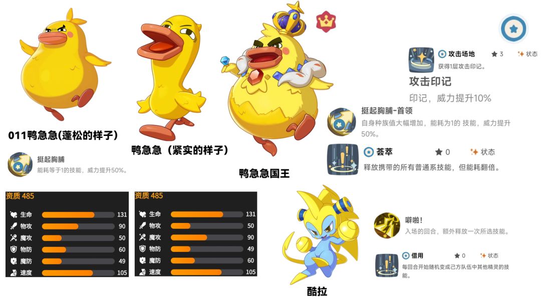 今天给大家带来的是手游吉祥物——鸭急急和板板壳 部分精灵可能会有多种外观 大多同时伴随着资质的改变 比如胖的鸭急急物攻比较高 而瘦的鸭急急魔攻比较高 以后的形态变化就不多赘述 普通系的强力技能:荟萃