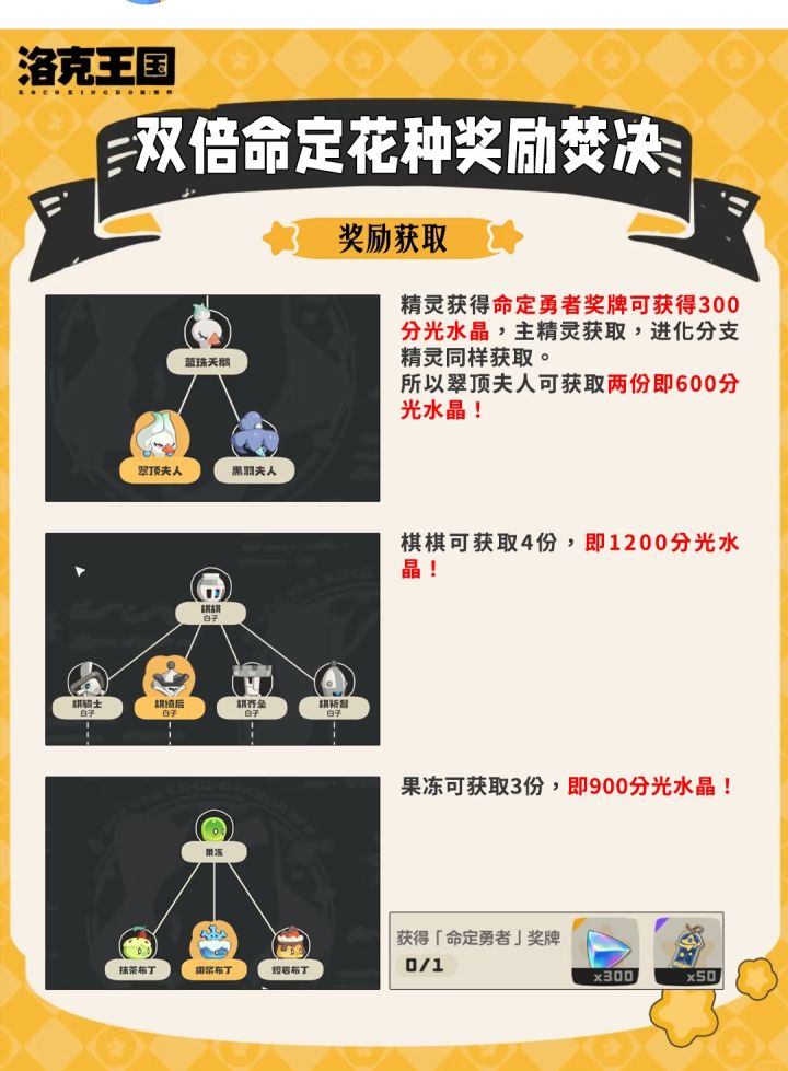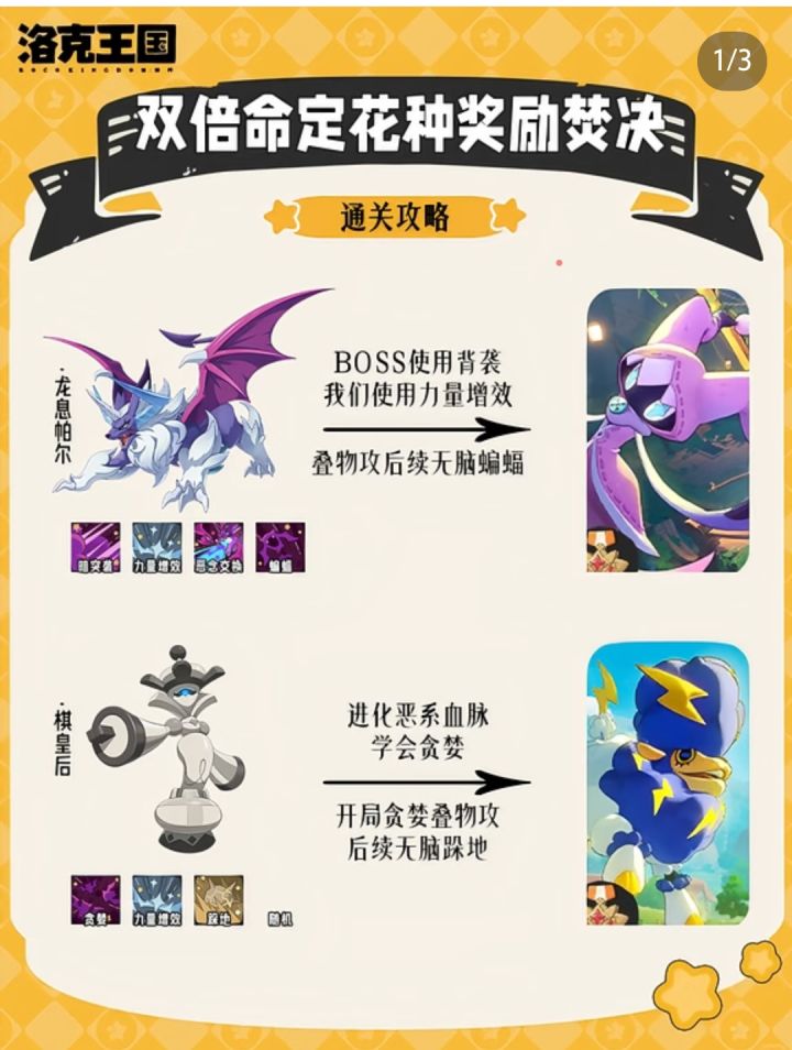 ⚠️ 别再用老宠硬冲了!这期命定花种藏着家族连坐机制:用没拿过“命定勇者”奖牌的精灵通关,其进化分支全员白送300光水晶!选对分支怪,一次能薅4份奖励 。💎 抄作业拿满3100分👉 电咩咩:上 棋皇后/棋契陛下(4分支),通关直接爆 1200分!👉 幽冥眼:用 翠顶夫人(2分支),躺赚 600分。👉 雪影娃娃:派 熔岩布丁(3分身),稳收 900分。👉 梦悠悠:龙息帕尔 顺手做赛季任务