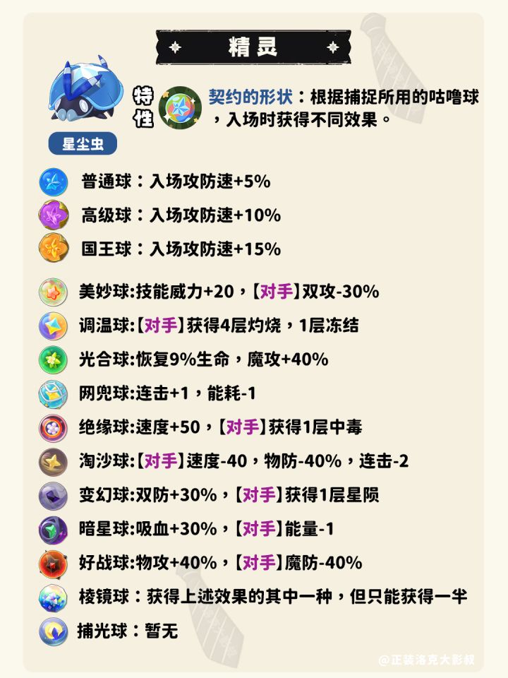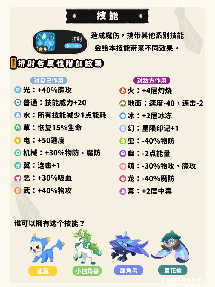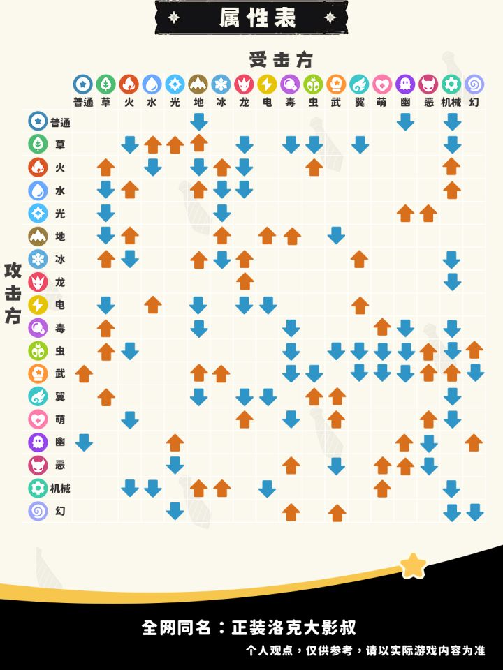 折射技能、兽花蕾、星尘虫、属性克制表、咕噜球合成材料、性格表。