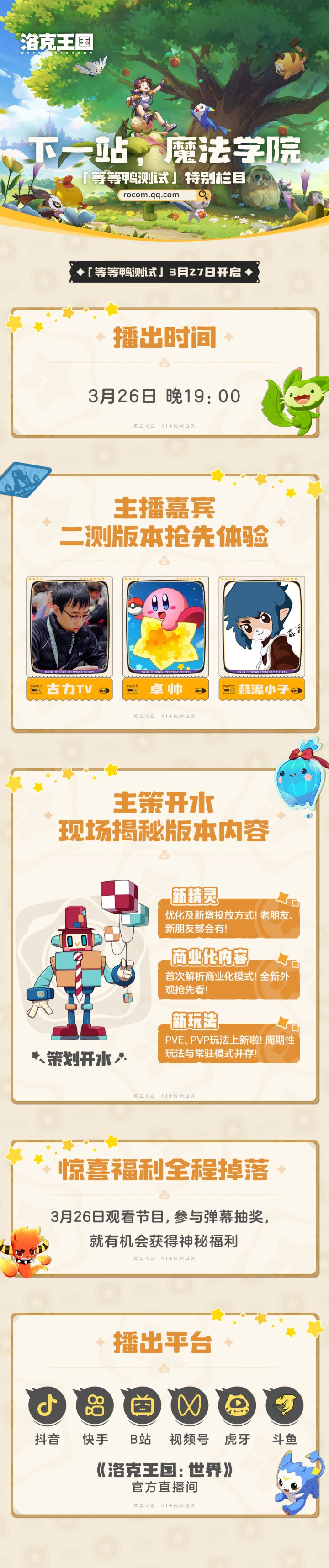「等等鸭测试」特别栏目即将于3月26日晚19:00播出!主策开水又又又又来给各位小洛克汇报啦!这次的内容会详详细细给大家揭秘测试内容:-新精灵-新玩法-商业化模式完整呈现,包的!深度剖析,包的!福利掉落,包的!各大平台《洛克王国:世界》官方直播间同步播出~3月26日晚,咱不见不散!
