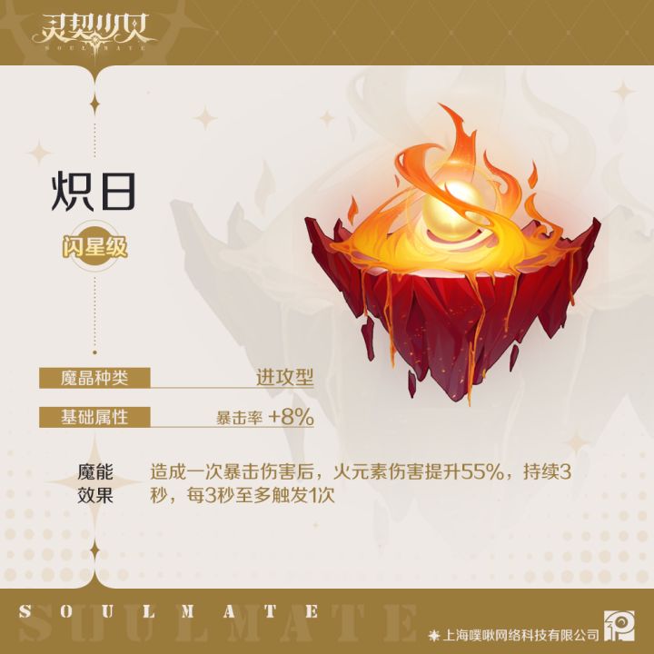 各位冒险者,蕴含神秘力量的魔晶能赋予装备独特的魔能效果,选择适合的魔晶将极大的增强装备效果。限时星咒熔醒up【玄晖夕照】:2月16日~2月29日【炽日】星级:闪星级种类:进攻型基础属性:暴击率+8%魔能效果:造成一次暴击伤害后,火元素伤害提升55%,持续3秒,每3秒至多触发1次【黄昏】星级:闪星级种类:进攻型基础属性:物攻加成+17%魔能效果:魔晶[狂熊]的熊影攻击范围大幅提