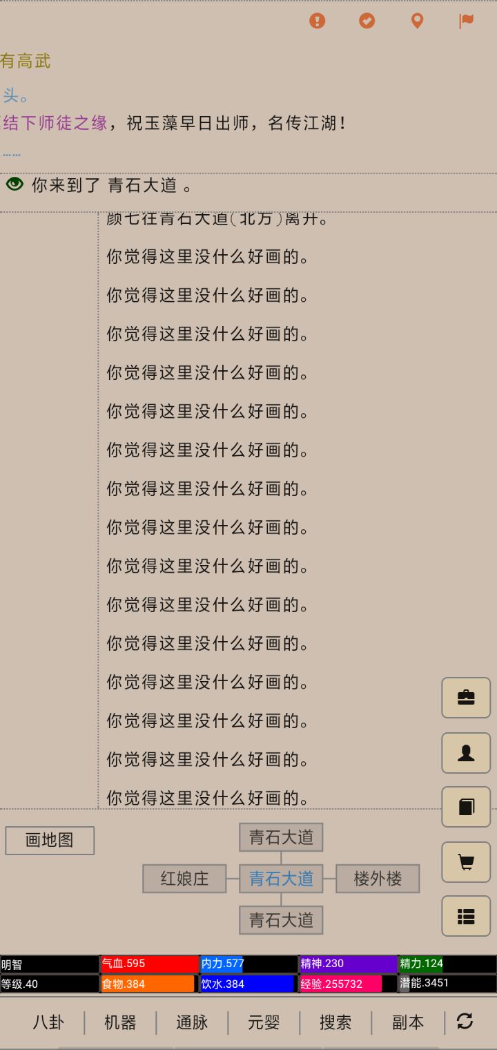 到此希望江湖mud越办越好,游戏更新的方向往内容创新靠近些,文字游戏的表现形式就是文字,我们需要更完整的江湖,有血有肉的江湖。