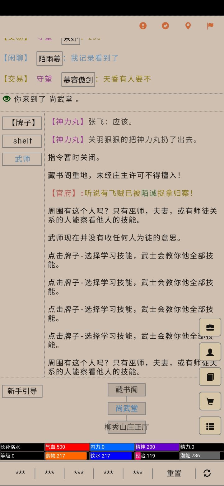 在游戏开始,你会出生在一个新手村,这个地方是选择人物性格天赋点地方。点击左下“洗心池”新手前期建议刷一个鸿运天赋,最好是三天赋,玩歌姬的一定要有鬼脉,普通的一般是鸿运小周天杀气天神。然后经过前期的任务会让你选择门派,这里没有要求,随便选,玩毒去星宿,玩剑去华山(不唯一),选好门派后去到扬州的书院学习读书,买书,学读书写字到100,去铁匠铺挂机,刷阅历到200,然后就可以去衙门接一些杀人任务,无限制