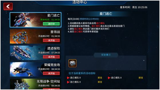 星门逃亡活动将在早上10点开启活动持续2小时,活动开启后在各大争夺星区会刷新出逃亡舰队;逃亡舰队会在各星区的主星开始出发前往星门,玩家需要在逃亡舰队到达当前星区的星门前阻止逃亡舰队,否则等到逃亡舰队进入星门后舰队就会消失就无法进行攻击了;在活动界面点击“前往”游戏就自动定位到逃亡舰队当前的地点;看到逃亡舰队后,点击进行拦截就可以派遣你的舰队进行攻击。