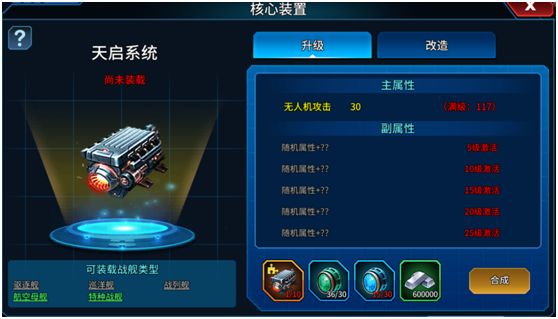 核心装置可以大幅提升玩家战舰的作战能力,在游戏里核心装置是可以根据玩家的战略需求装载在各种战舰上;核心装置只能装载在指定类型战舰上,而且每一种核心都是唯一的不可以通过制造重复获得,如果需要把核心装载到别的船只上就必须先卸载下来,才可以装载到别的战舰上(卸载核心不会造成任何损失);玩家可以点击造船厂然后点击核心就可以打开核心装置的界面,打开界面后就可以看到各种核心;选择要制造的核心后,就可以进
